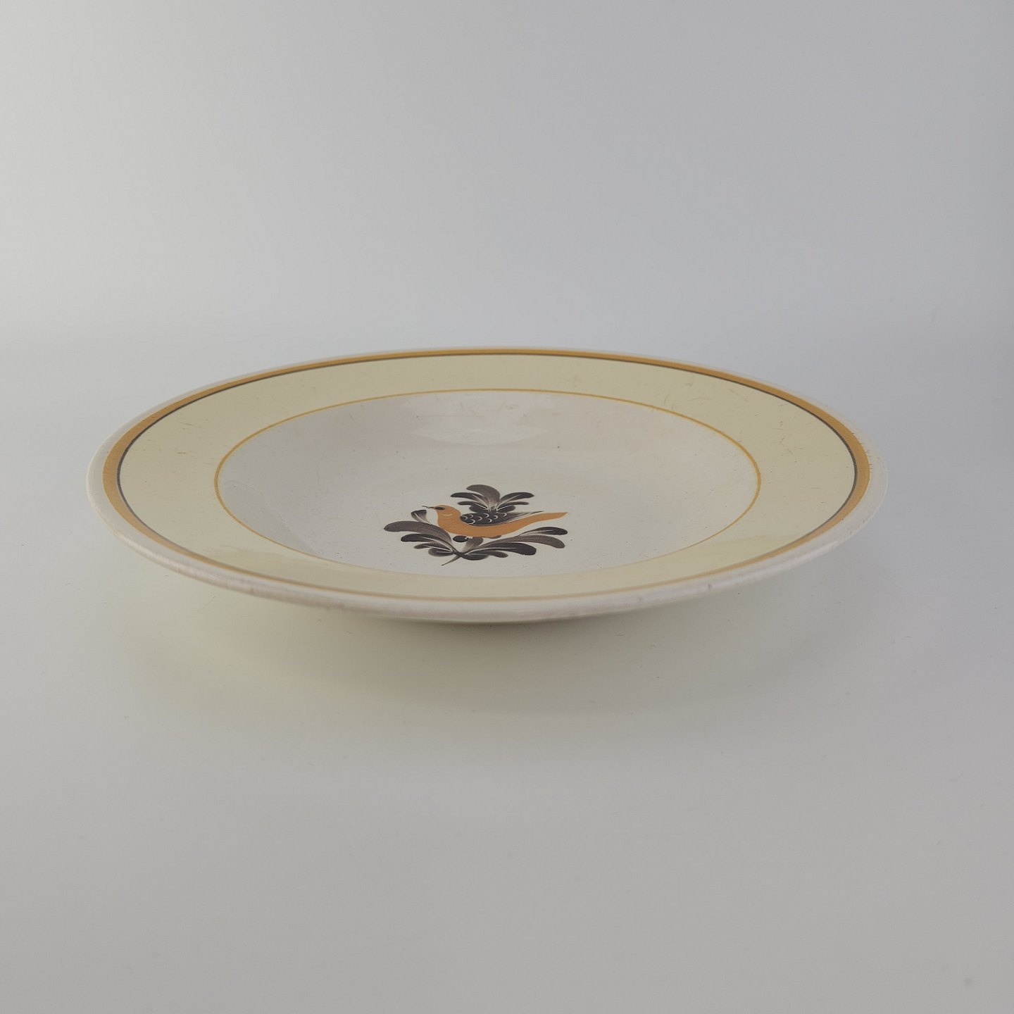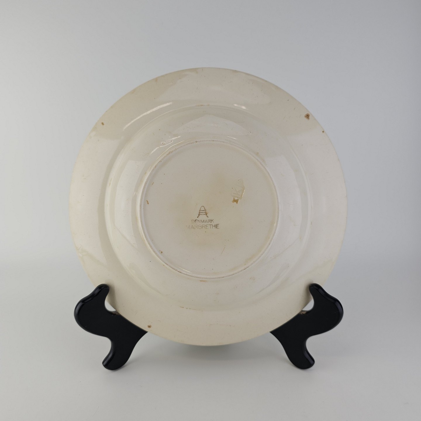 Dyb tallerken i fajance fra stellet Margrethe fremstillet i perioden 1937-1940.Formgiver Nils Thorsson