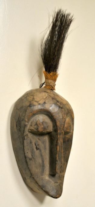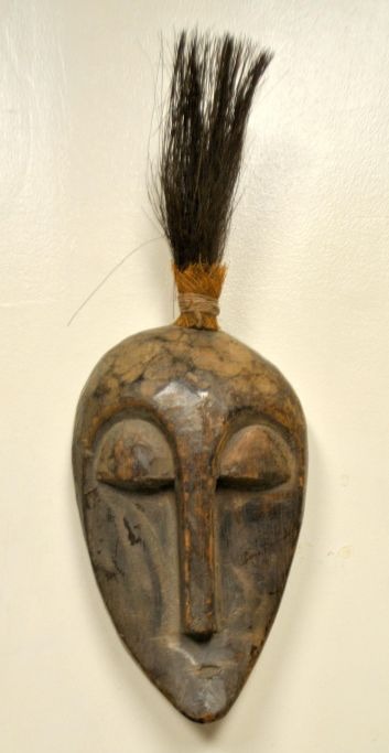 Kleine, geschnitzte afrikanische Holzmaske, Mitte des 20. Jahrhunderts. Oberseite aus Tierhaar. Höhe: 30 cm.Bestellnummer: 29024