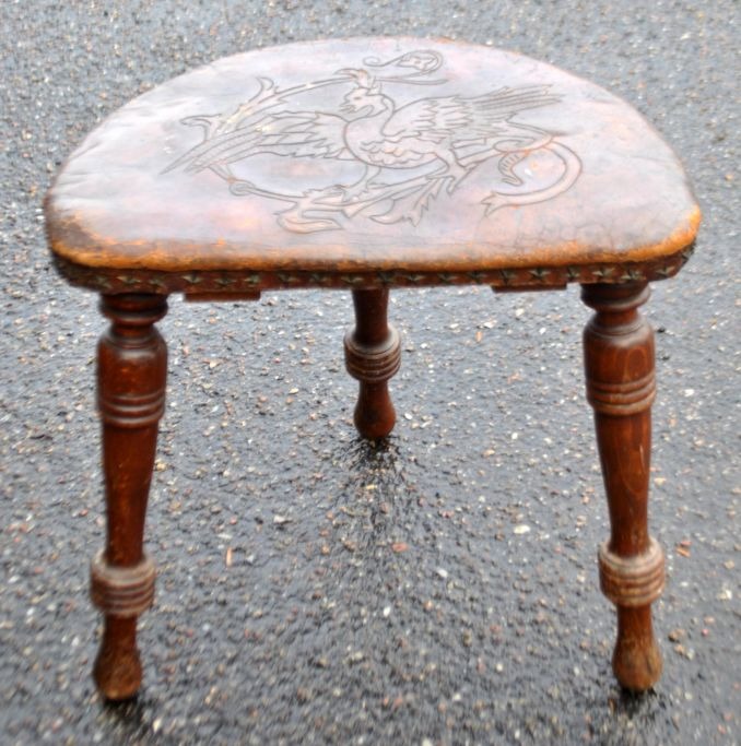 Dreibeiniger Holzhocker mit Ledersitz, 19. Jahrhundert. Geschnitztes Leder mit Hahnenmotiv. Nieten in Stern- und Blumenform. Höhe: 39 cm. Breite: 40 cm. Tiefe: 33 cm.Bestellnummer: 29030