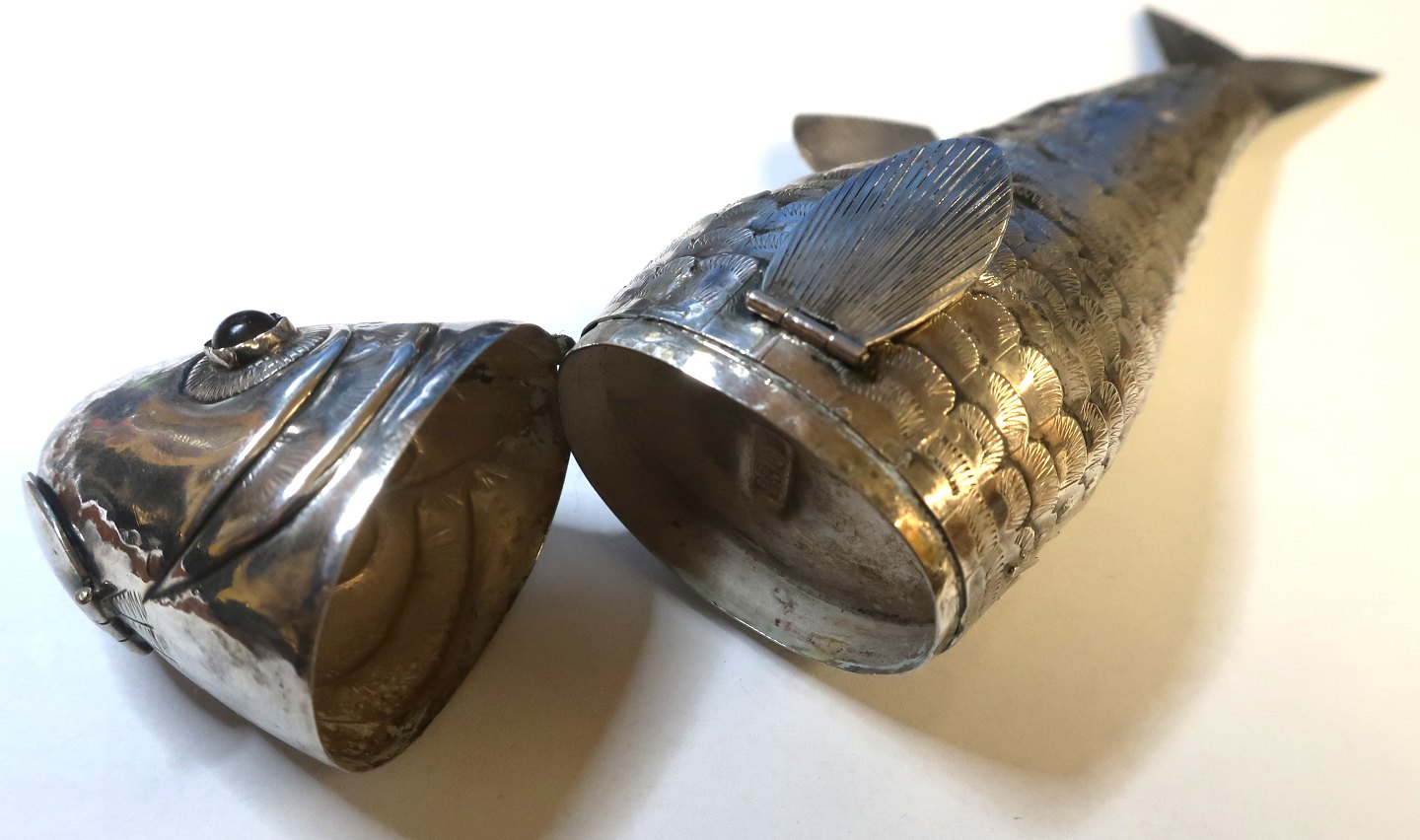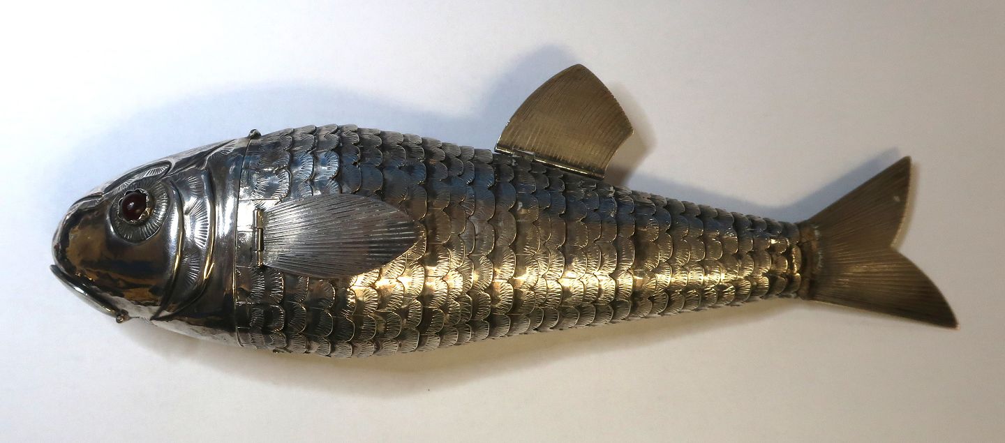 Silbernes vinagrette in Form eines Fisches mit roten Steinen. Länge 17 cm Händler