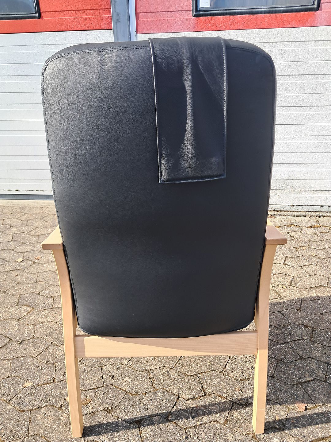 Farstrup lænestol og skammel i bøgetræ med læderbetræk, fra 2010erne.