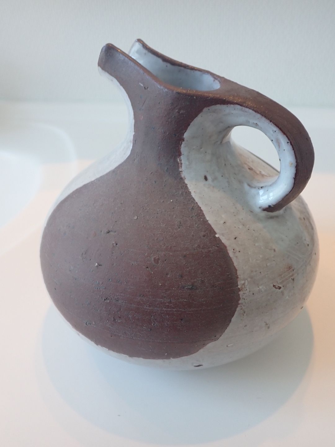 Gutte Eriksen (1918 - 2008) - spaltekande i hårdtbrændt ler med delvis, skulpturel glasering i lysegrå nuance. Ca. 1950. Højde: 14 cm. Bredeste bredde: 13,5 cm. I fin stand. Händler