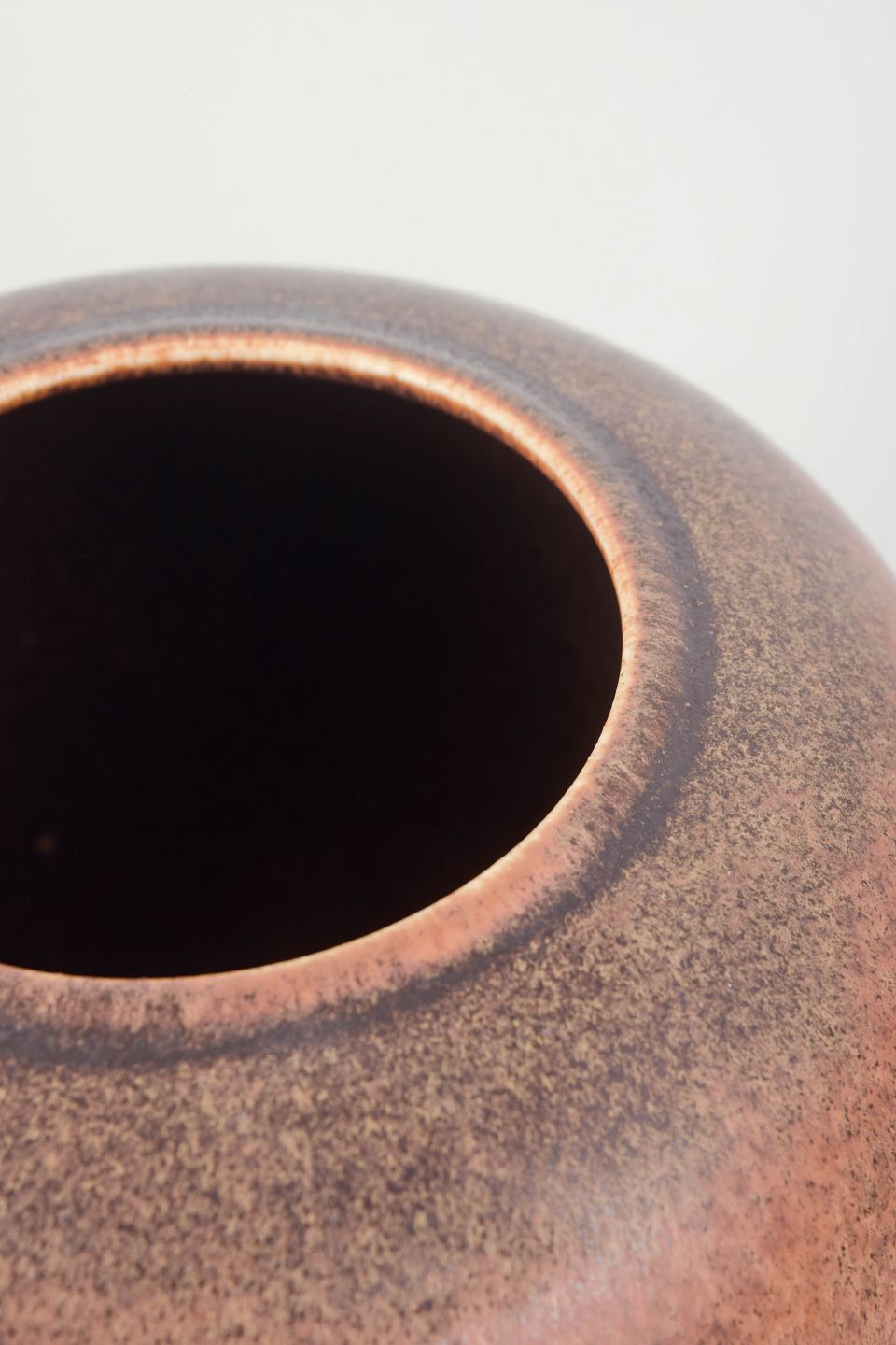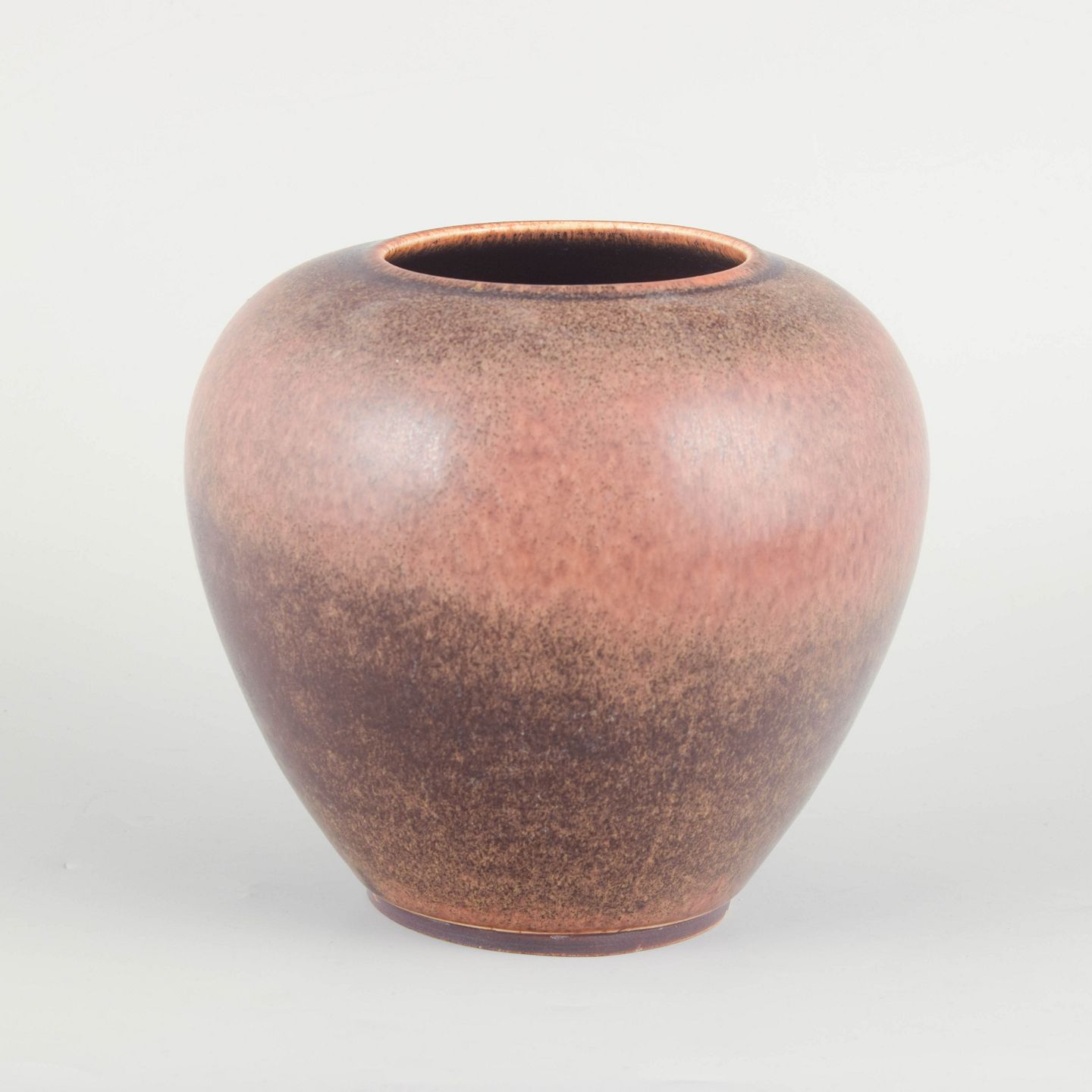 Saxbo, stor vase.Stor, rundbuet vase i stentøj med bred åbning og fyldig korpus. Glasuren er i varme rosa og brunlige nuancer med blød overgang og dyb, levende overfladekarakter, typisk for Saxbos eksperimenterende glasurarbejde.