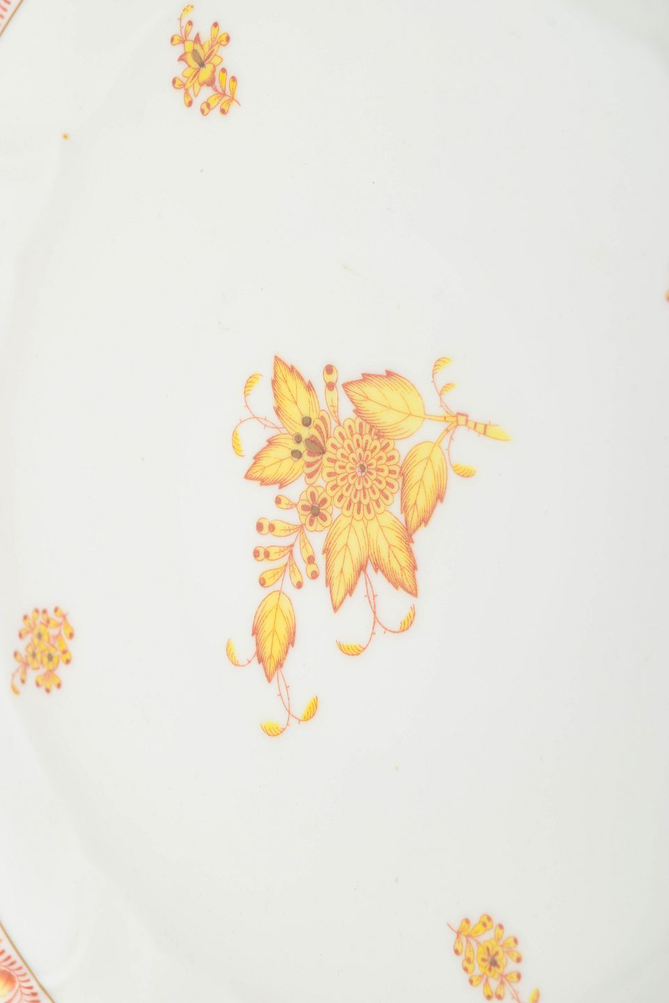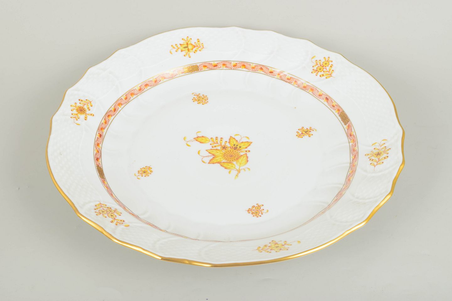 Herend Chinese Bouquet, stort fad.Imponerende og generøst porcelænsfad fra Herend dekoreret i Chinese Bouquet med central blomsterbuket i gyldne og varme nuancer, omgivet af fine spredte blomstermotiver og elegant guldkant. Den let bølgede rand og diskrete reliefstruktur understreger fadets klassiske og harmoniske udtryk. Et markant serveringsfad fra midten af det 20. århundrede med fornem håndmalet dekoration.