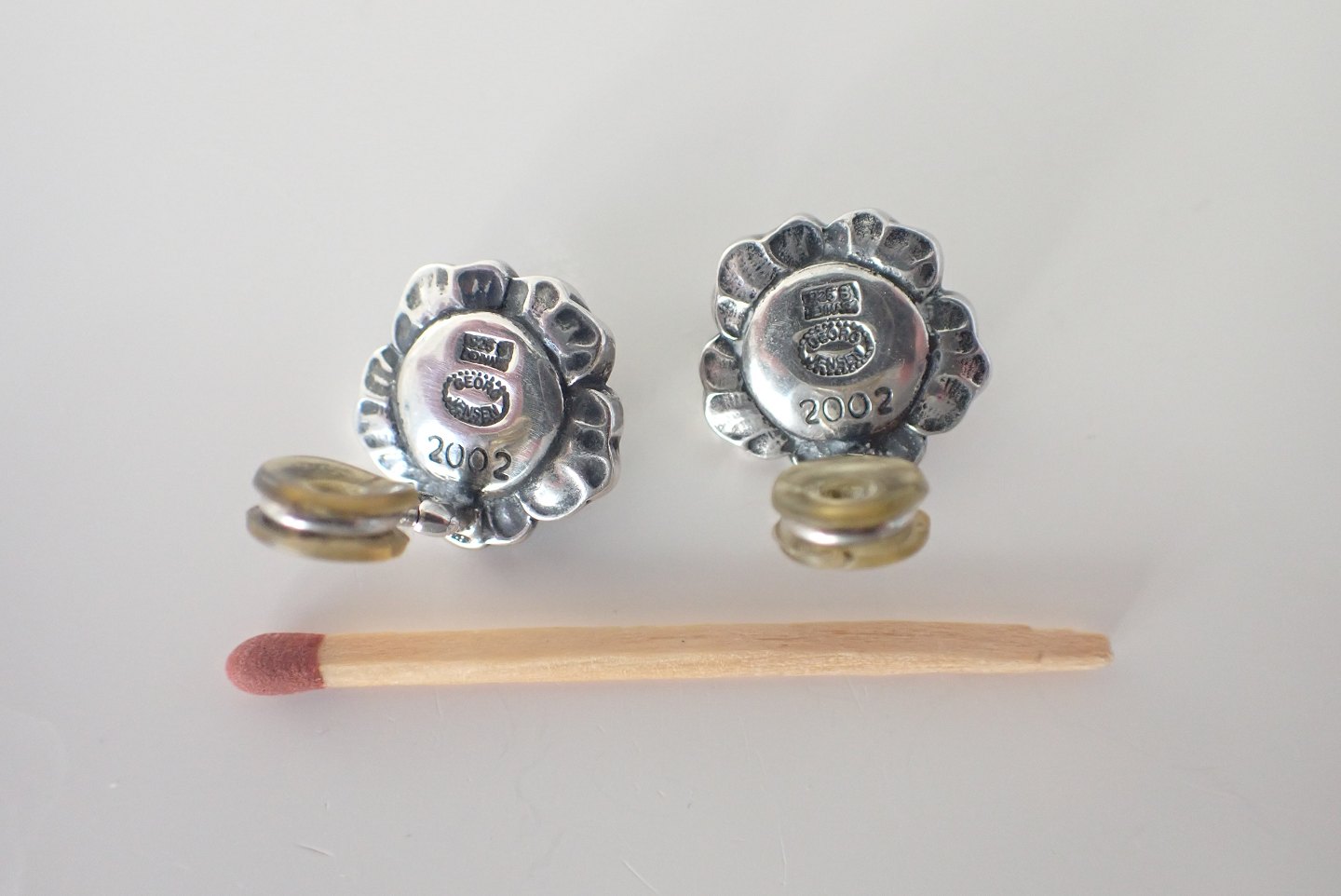 Georg Jensen årssmykke 2002 - blomsterøreklips i sterling sølv med en cabochonsleben granat i hver. Stemplet Georg Jensen, 2002, 925.s Denmark. Med gummipropper i clips. Samlet vægt: 11 gram. Diameter på blomst: 1,8 cm. I fin stand. Händler