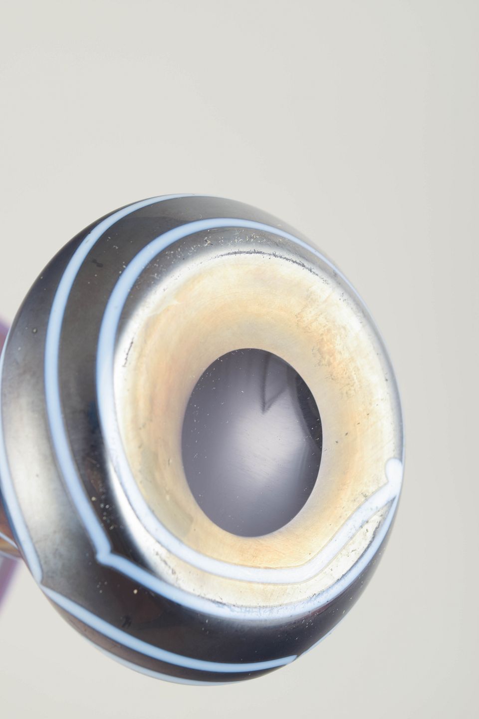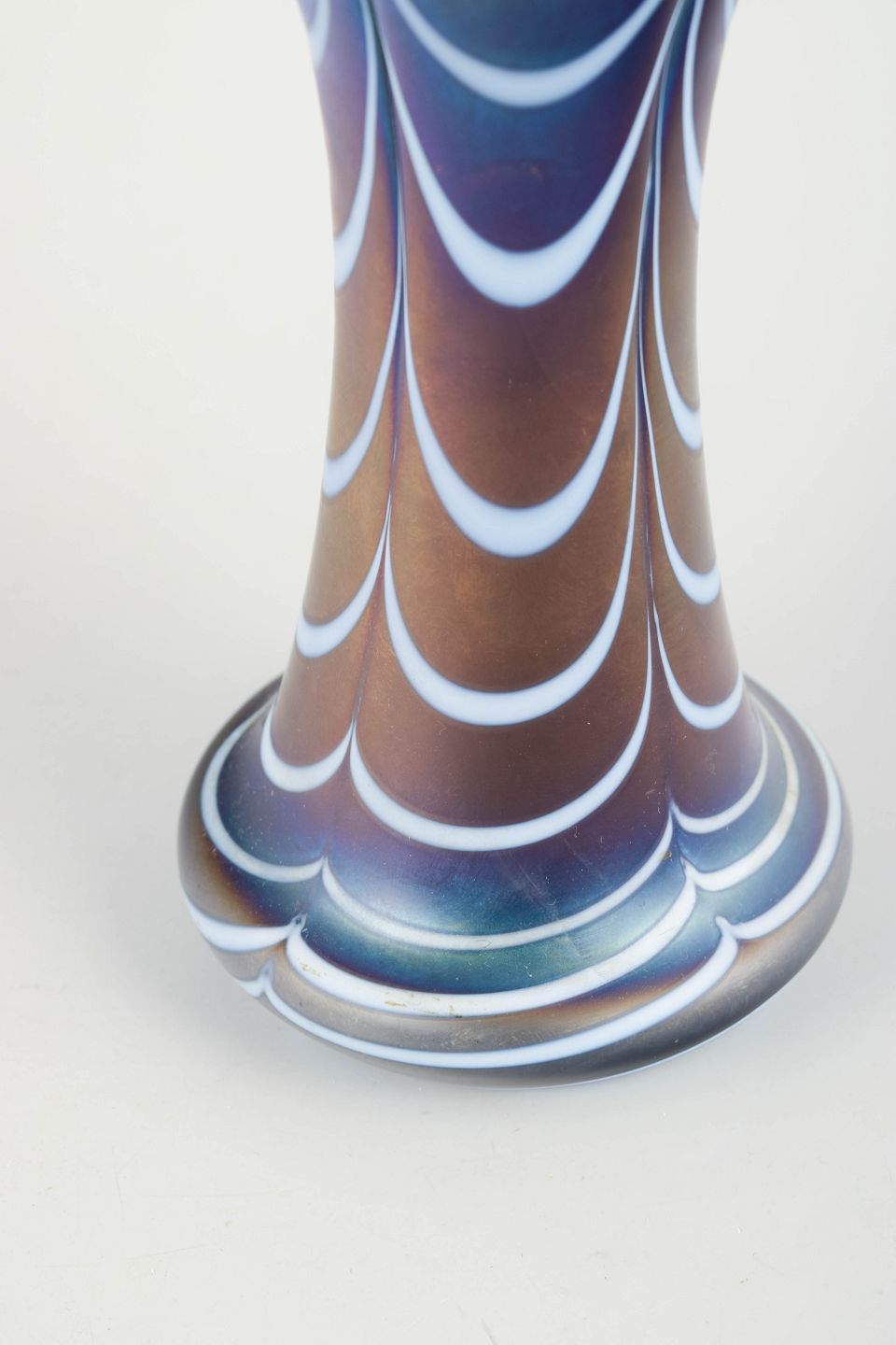 Loetz iriserende glasvase.Større vase i mundblæst glas med rundet korpus og bred, let udadbøjet rand. Overfladen fremstår med silkemat iriserende finish i gyldne, blålige og let violette nuancer, som skifter afhængigt af lyset. Den harmoniske, balancerede form kombineret med det metalliske farvespil er karakteristisk for Loetz’ produktion i 1920’erne, hvor enkle klassiske former blev forenet med raffinerede overfladeeffekter.