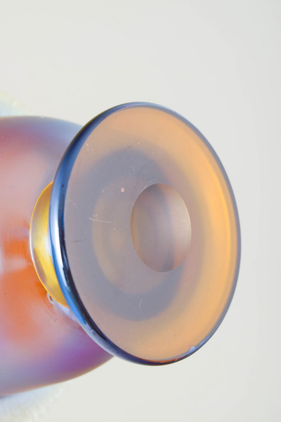 Loetz iriserende glasvase.Skålformet vase i mundblæst glas med bred, let udadbøjet rand og kort standfod. Overfladen har en silkemat iriserende finish i blå og violette nuancer med varmt kobberfarvet skær indvendigt. Den enkle, klassiske form kombineret med det levende farvespil er karakteristisk for Loetz’ produktion i 1920’erne, hvor harmoniske proportioner og metallisk glans var centrale æstetiske virkemidler.