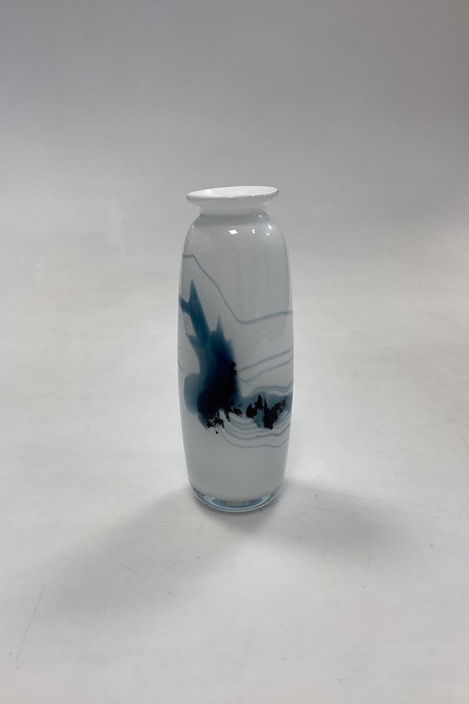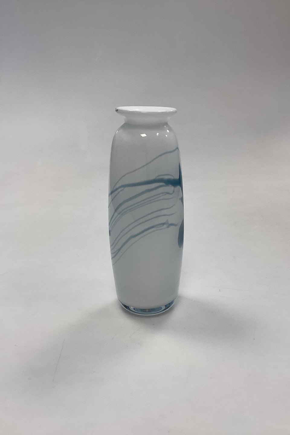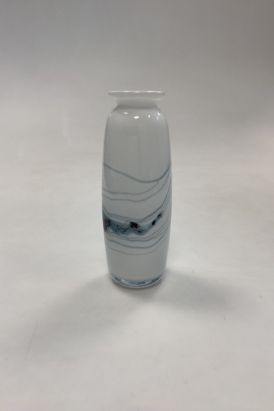 Holmegaard Atlantis Vase. Hvid med blå dekoration. Designet af Michael Bang. Måler 15 cm / 5,90 in.