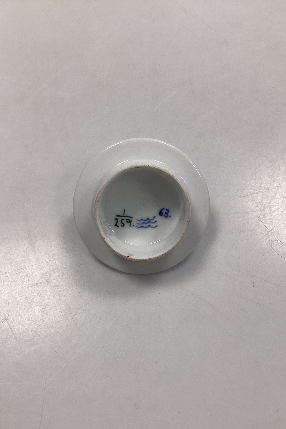 Royal Copenhagen Musselmalet Riflet Låg til Tekande No. 259. Indre diameter måler 5,4 cm / 2,12 in. 1. Sortering med brændingsrevne inderst, se foto.Lager: 1