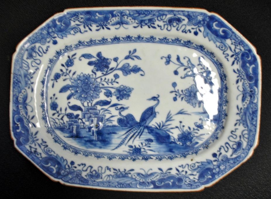 Chinesische, blau dekorierte, achteckige Schale, ca. 1780. Kangxi-Dynastie. Verziert mit Landschafts-, Vogel- und Blumenmotiven. Unmarkiert. L.: 31,5 cm. B.: 23 cm.Einwandfreier Zustand!
