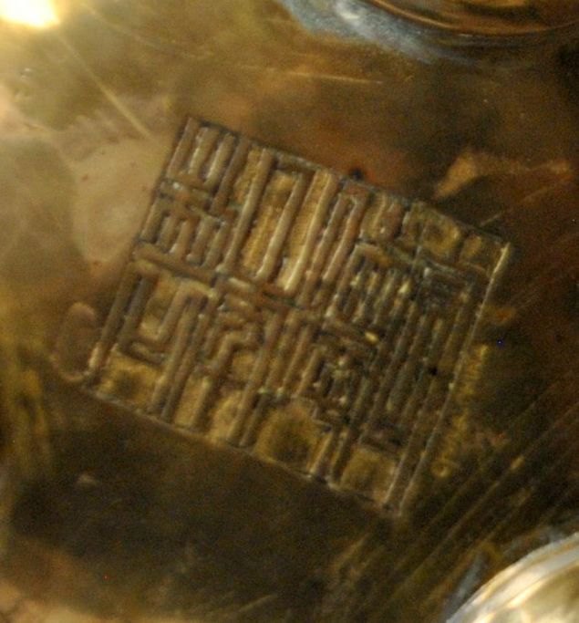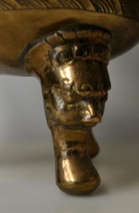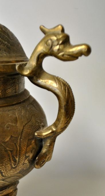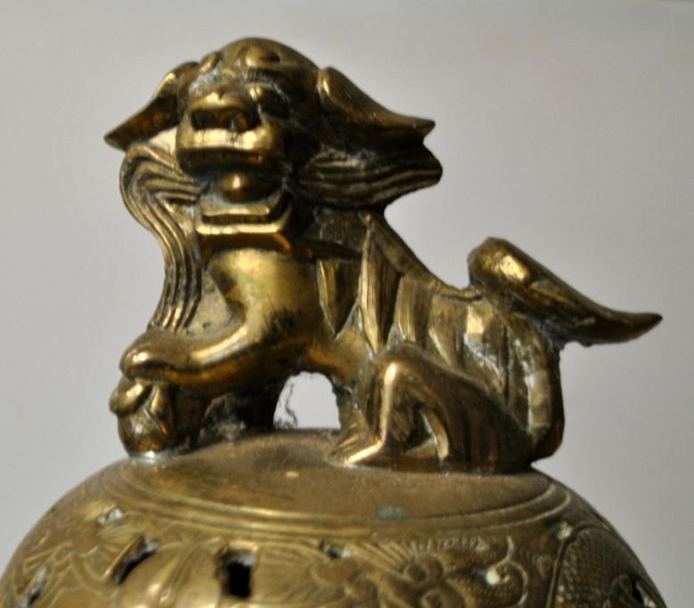 Dreibeiniger chinesischer Räuchergefäß aus Bronze, 19. Jahrhundert. Mit zwei Henkeln; durchbrochener Deckel mit Löwenmotiv. Der Korpus ist mit einem Drachen und Blumen verziert. Höhe: 32 cm, Breite: 25 cm. Gestempelt.Bestellnummer: 29042