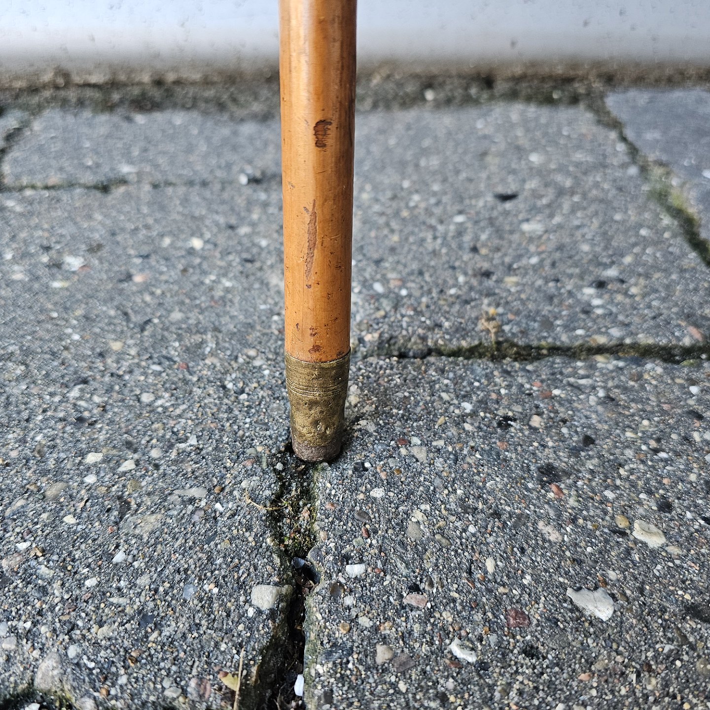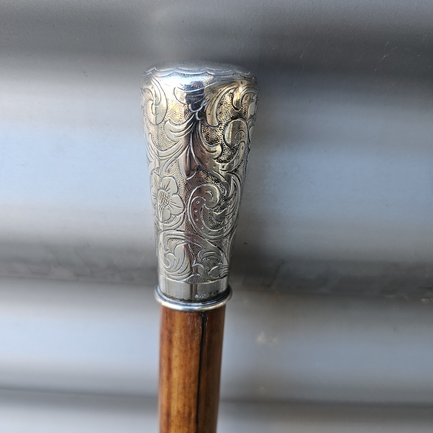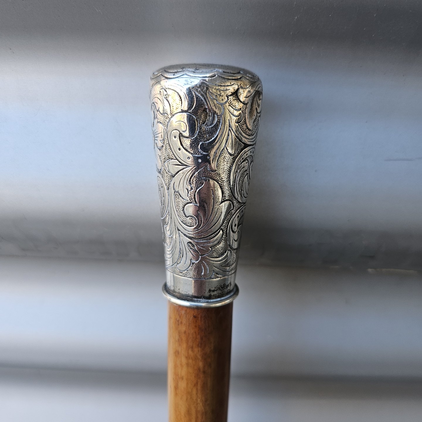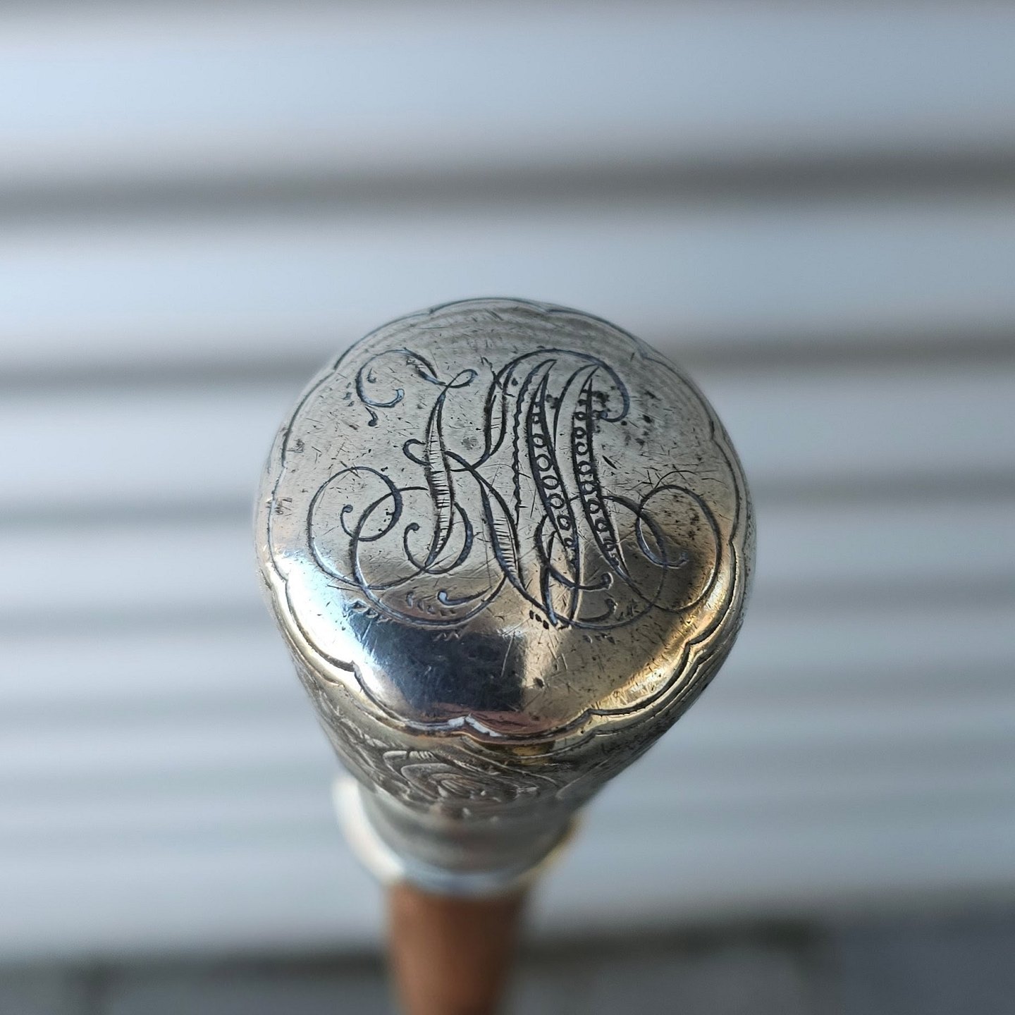 Stok i træ med knop af sølv, 826S Indgraveret KM og Rost