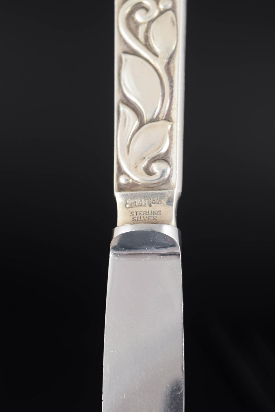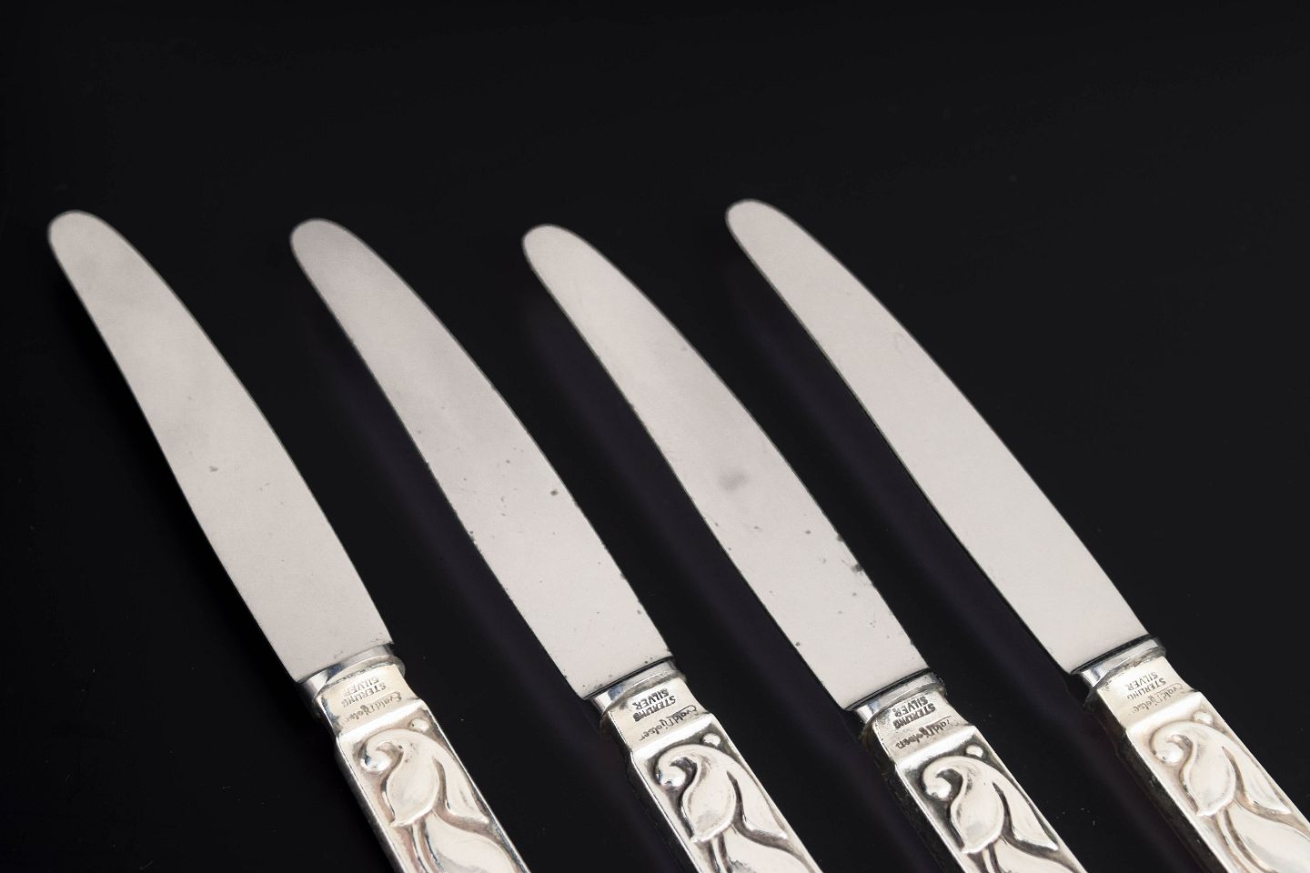 Evald Nielsen, sæt af fire frugtknive.Elegante frugtknive i sterlingsølv og rustfrit stål med klassisk, let afrundet skaftform og glat klinge. Fremstillet hos Evald Nielsen.