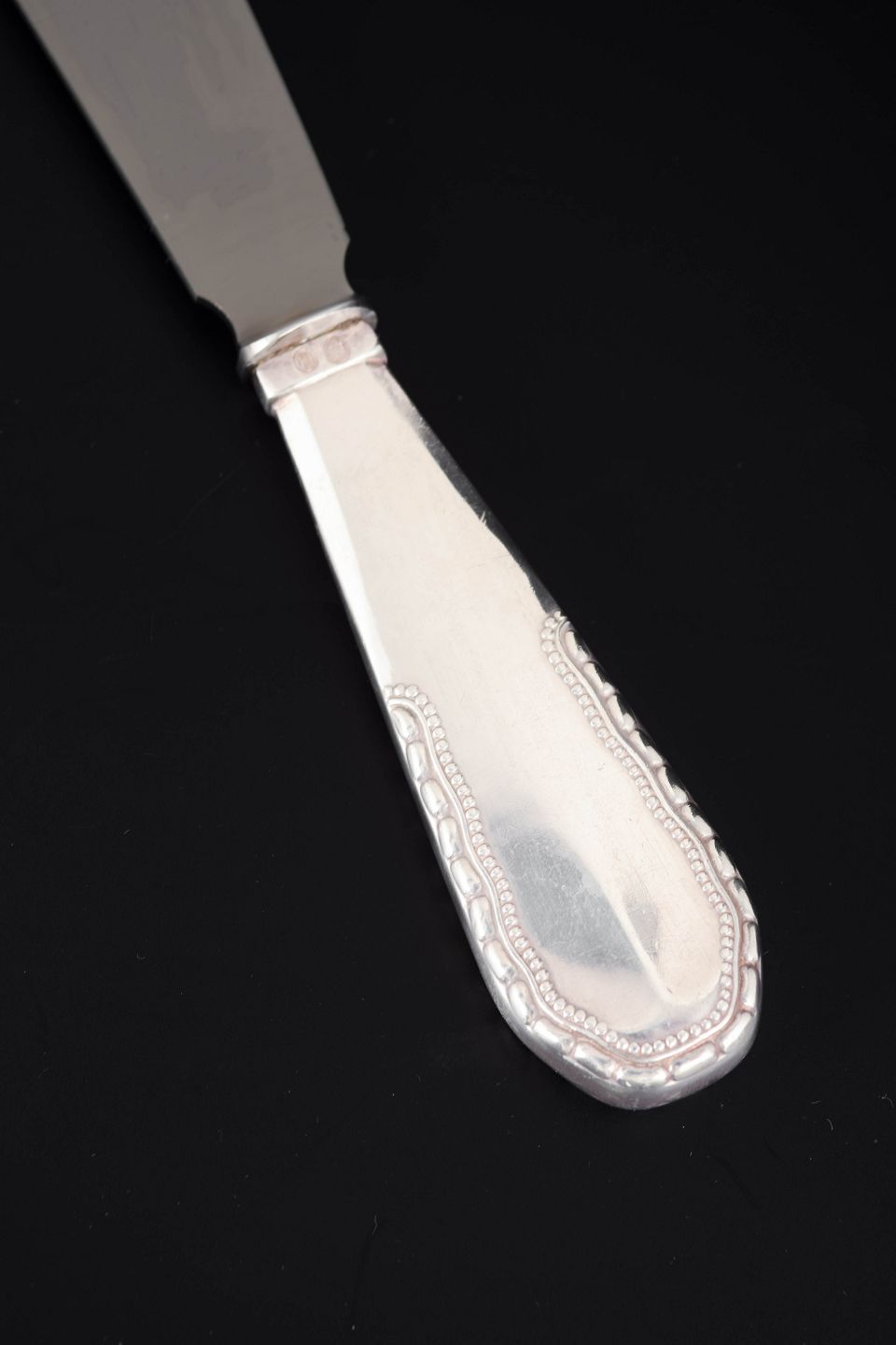 Georg Jensen, Nordisk lagkagekniv.Sjælden lagkagekniv, blad i rustfrit stål, skaft i tretårnet sølv i mønstret Nordisk. Kniven har et karakteristisk bredt blad med lille udskæring ved spidsen og et elegant sølvskaft med bløde former og dekorativ rand, typisk for Georg Jensens klassiske bestikdesign fra begyndelsen af det 20. århundrede. Mærket med tretårnet sølvstempel.