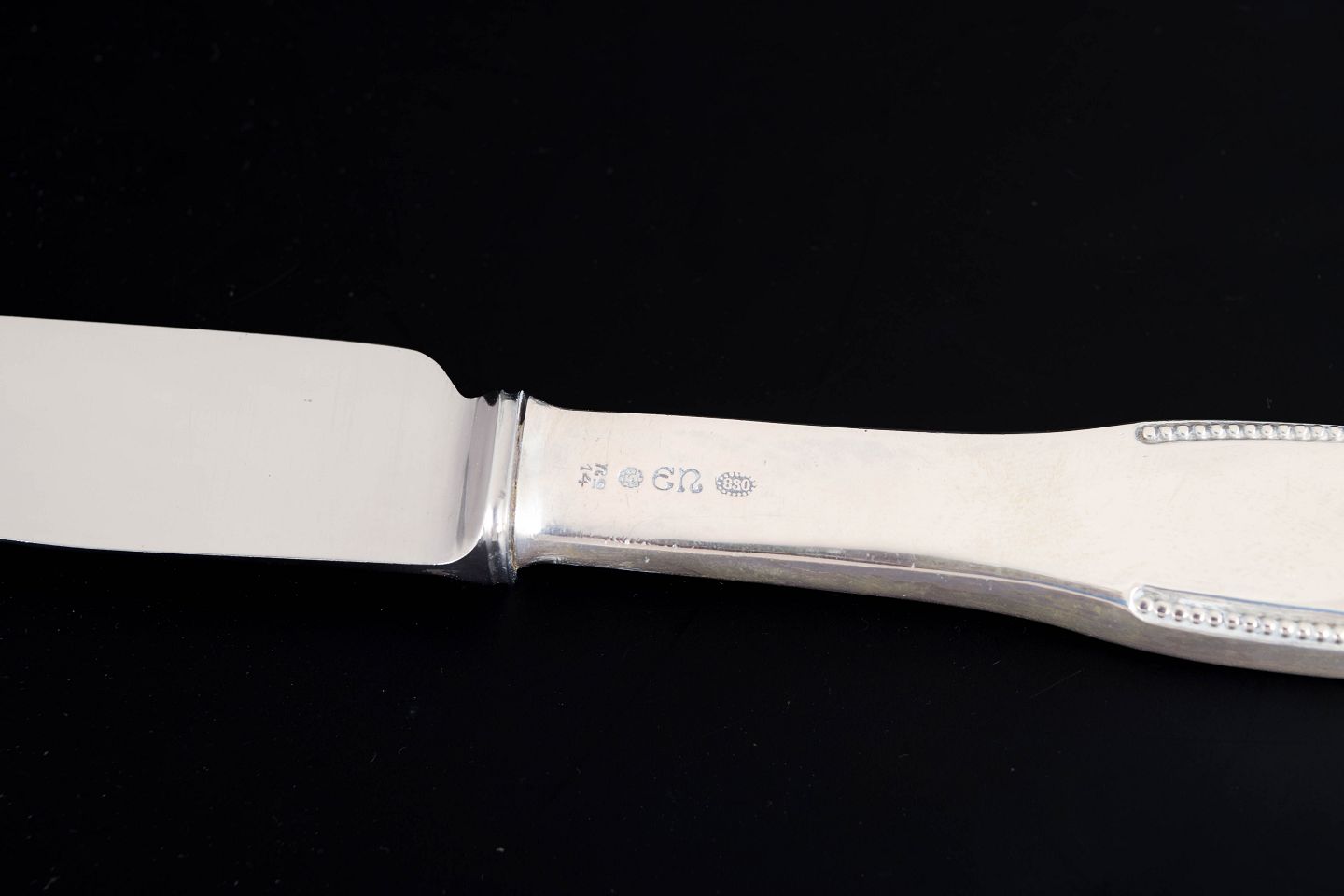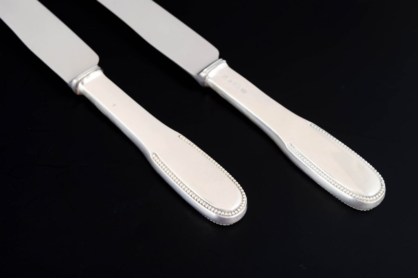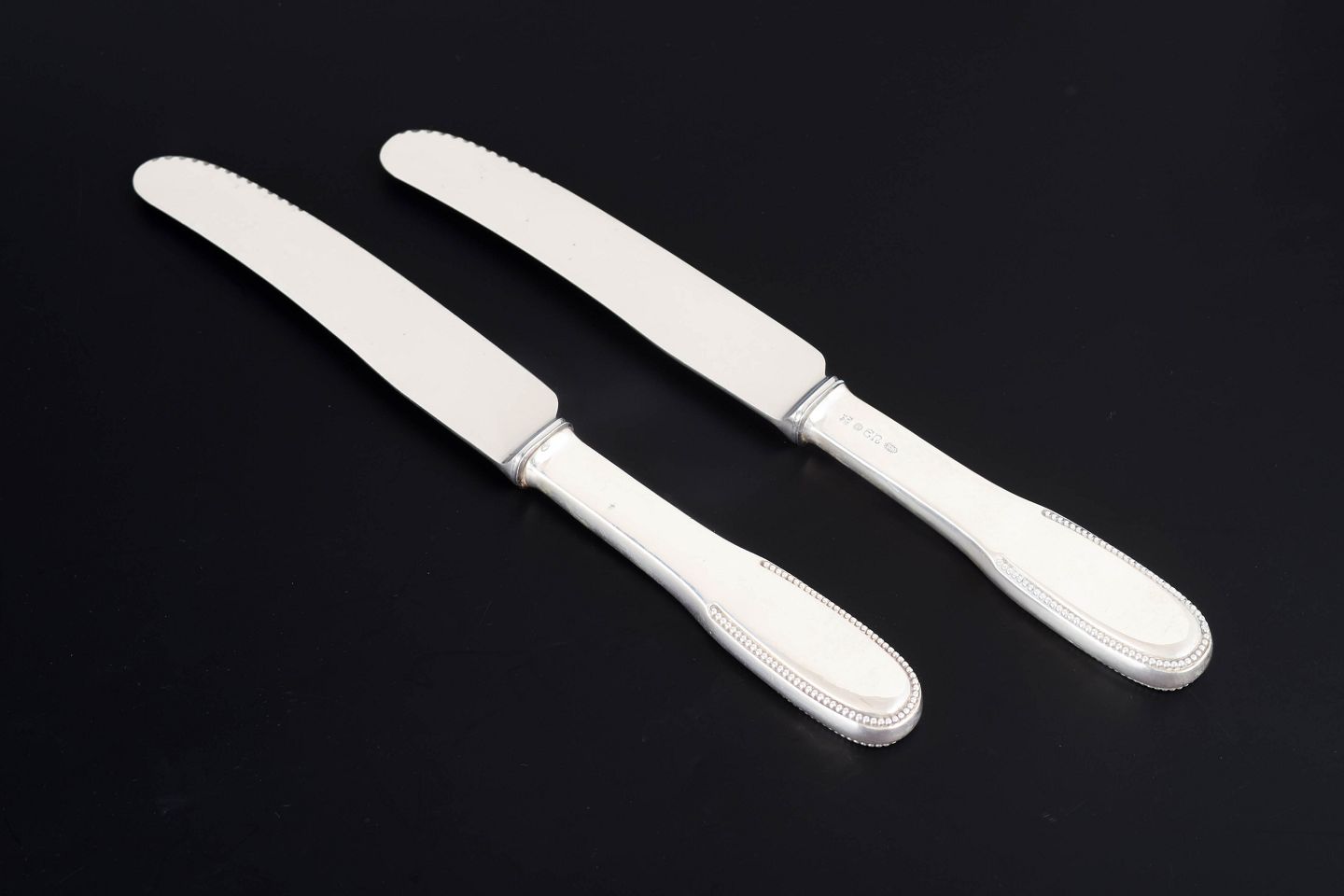 Evald Nielsen middagsknive, to stk. Model nummer 14.Elegante middagsknive i tretårnet sølv og rustfrit stål. Model nummer 14 med klassisk, let afrundet skaftform med diskret perlekant og glat klinge med skær. Fremstillet hos Evald Nielsen, længde 23,5 cm.