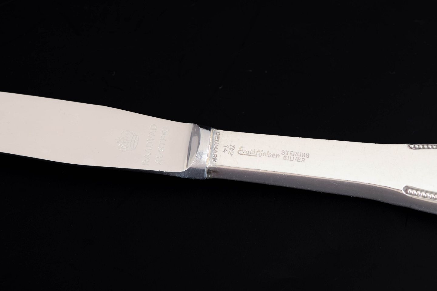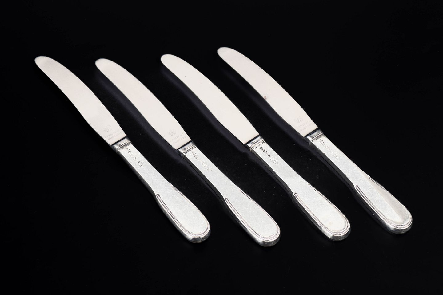 Evald Nielsen frokostknive, sæt af fire. Model nummer 14.Elegante frokostknive i sterling sølv og rustfrit stål. Model nummer 14 med klassisk, let afrundet skaftform og glat klinge. Fremstillet hos Evald Nielsen.
