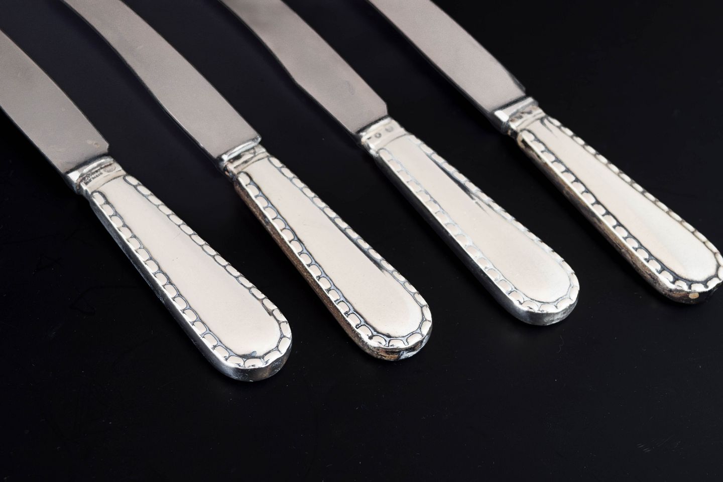 Georg Jensen, sæt af fire knive, Perle.Sæt af fire knive i rustfrit stål og tretårnet sølv i mønstret Perle fra Georg Jensen. Skaftet er udformet med en karakteristisk perlerand langs kanten, et klassisk dekorativt motiv som giver bestikket et elegant og tidløst udtryk.