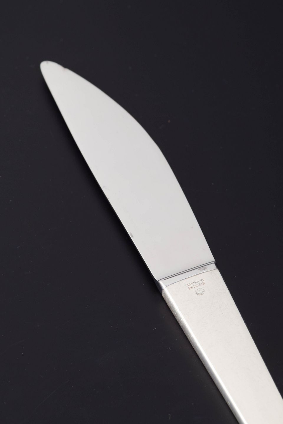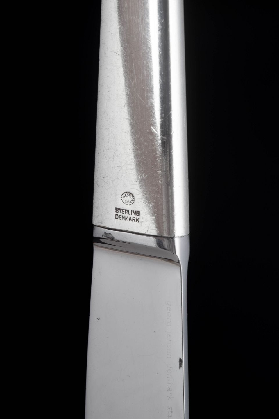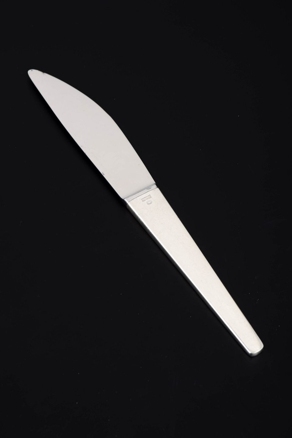 Frokostkniv i rustfrit stål og sterlingsølv i modellen Caravel, designet af Henning Koppel for Georg Jensen. Kniven er udført i et stramt og elegant formsprog med slanke linjer og let konisk form, karakteristisk for Koppels modernistiske design.