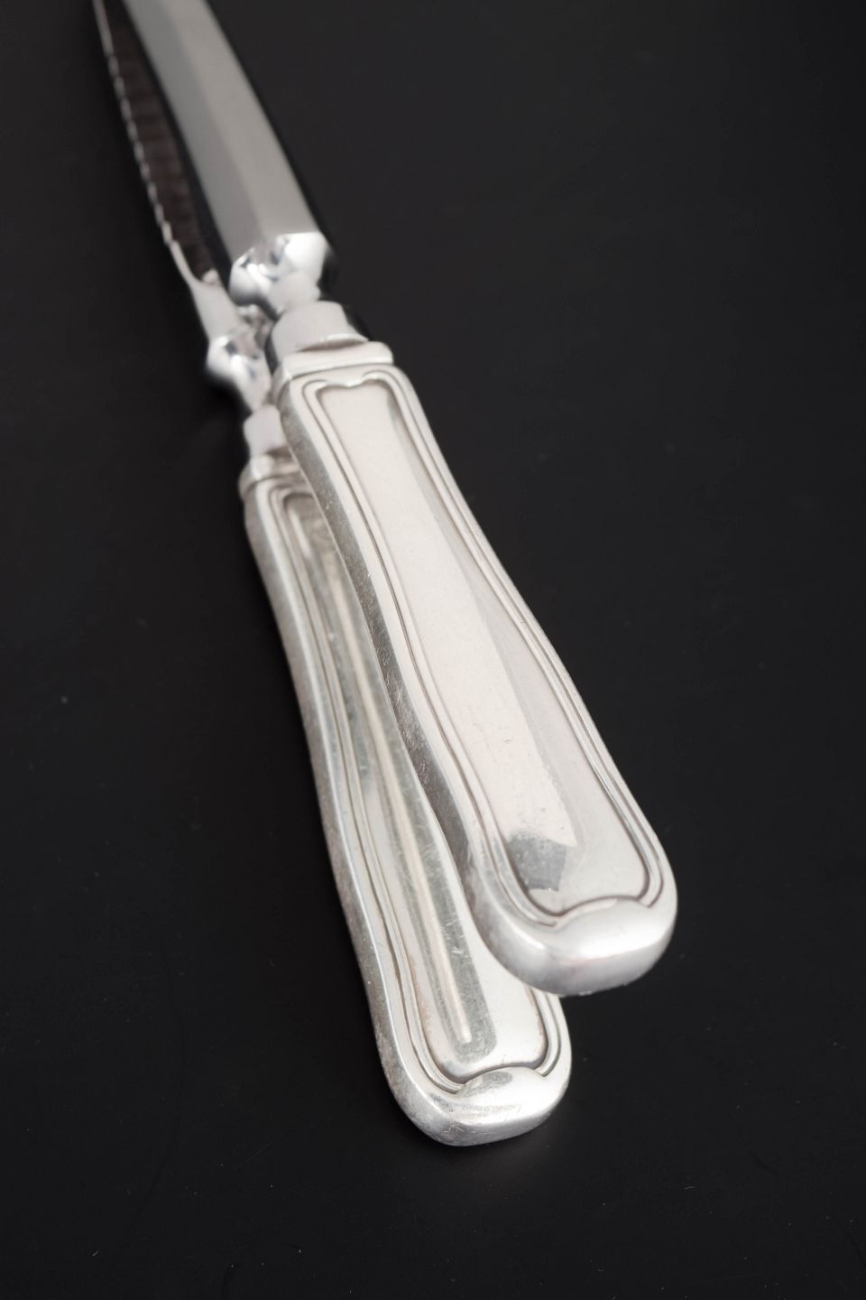 Georg Jensen, nøddeknækker Dobbeltriflet.Elegant nøddeknækker i rustfrit stål og sterlingsølv med skaft i mønstret Dobbeltriflet. Udført med kraftigt tandet greb til at knække nødder og med lange, elegante sølvskaft med de karakteristiske dobbelte rifler langs kanten. Et klassisk bestikdesign fra Georg Jensen.