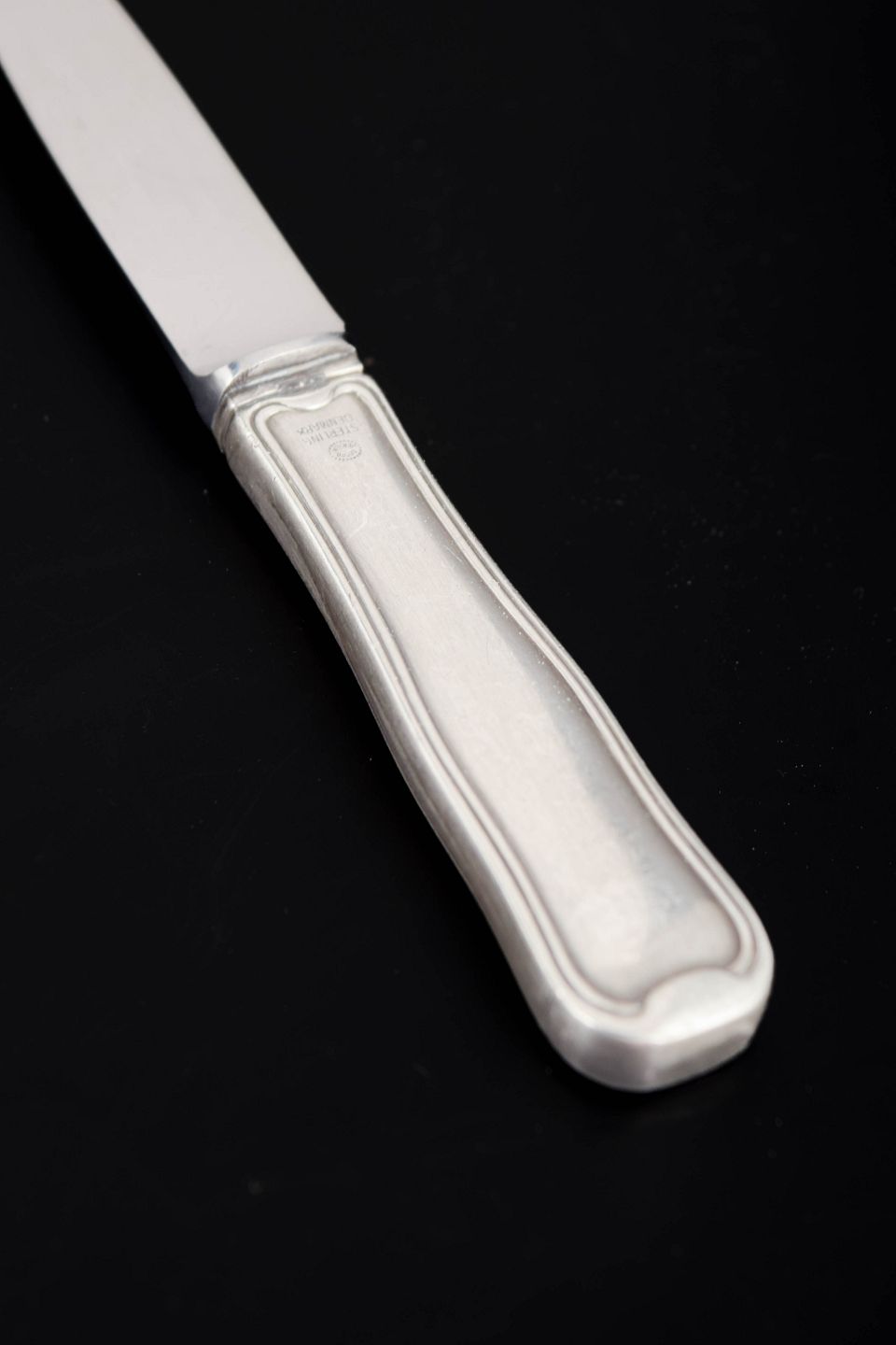 Georg Jensen, rejsekniv, Dobbeltriflet.Rejsekniv i rustfrit stål og sterlingsølv med skaft i mønstret Dobbeltriflet. Kniven har et slankt blad i rustfrit stål og et elegant sølvskaft med de karakteristiske dobbelte rifler langs kanten, et klassisk design fra Georg Jensen.