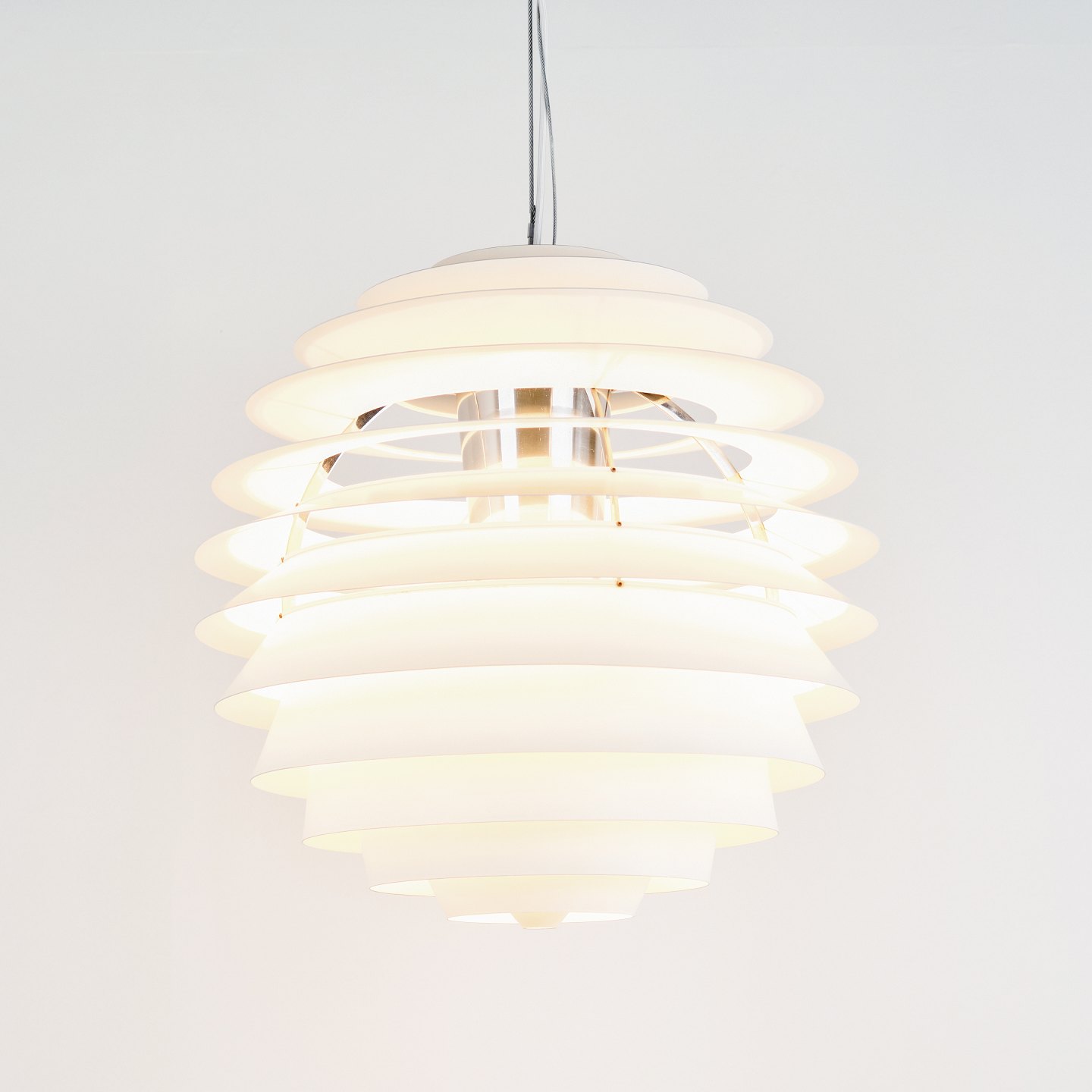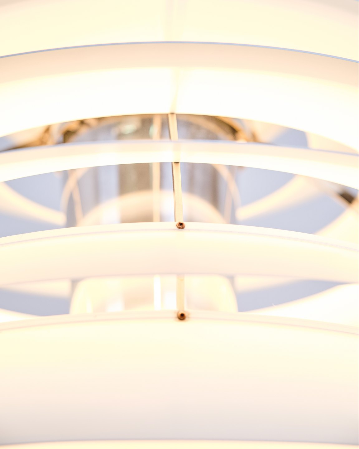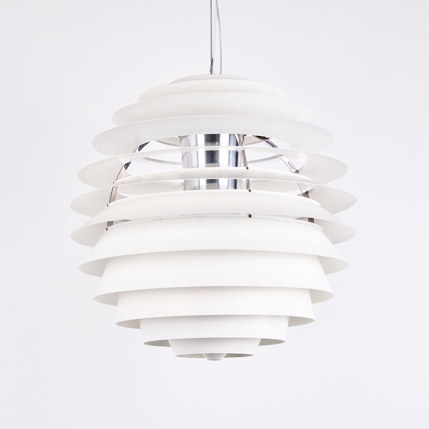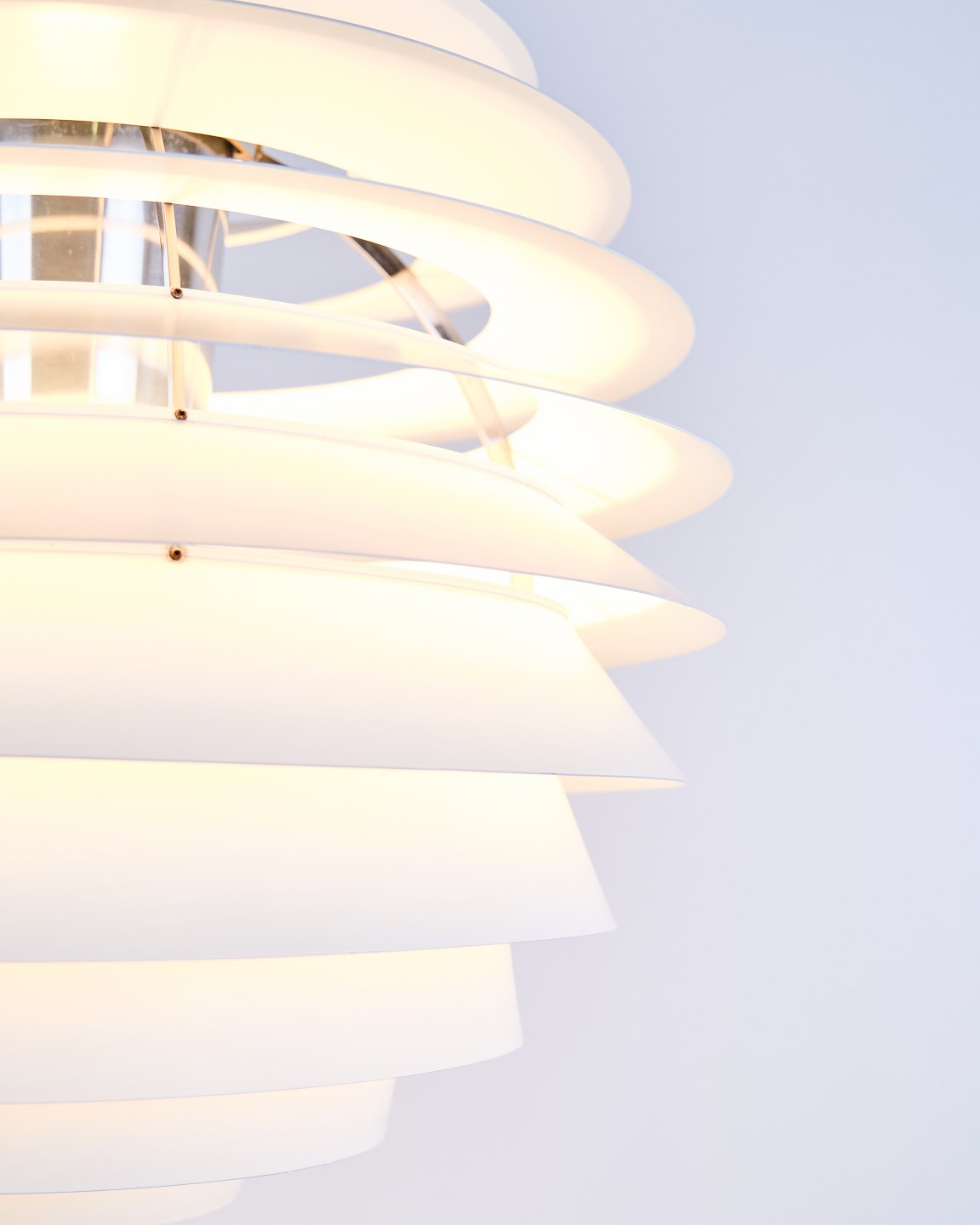Ikonische Pendelleuchte, PH Louvre (früher PH Kugle genannt), entworfen von Poul Henningsen im Jahr 1957 für die Adventistenkirche in Skodsborg. Die Leuchte besteht aus 13 Lamellen, die auf einer inneren Konstruktion montiert sind und ein weiches und blendfreies Licht gewährleisten. Das kugelförmige Design sorgt für eine gleichmäßige Lichtverteilung und einen skulpturalen Ausdruck.PH Louvre ist eine Weiterentwicklung von Henningsens früheren Arbeiten, darunter Spiralen aus dem Jahr 1942, und der Name bezieht sich auf die Lamellenstruktur, bei der das Licht elegant durch die Schirme gefiltert wird.