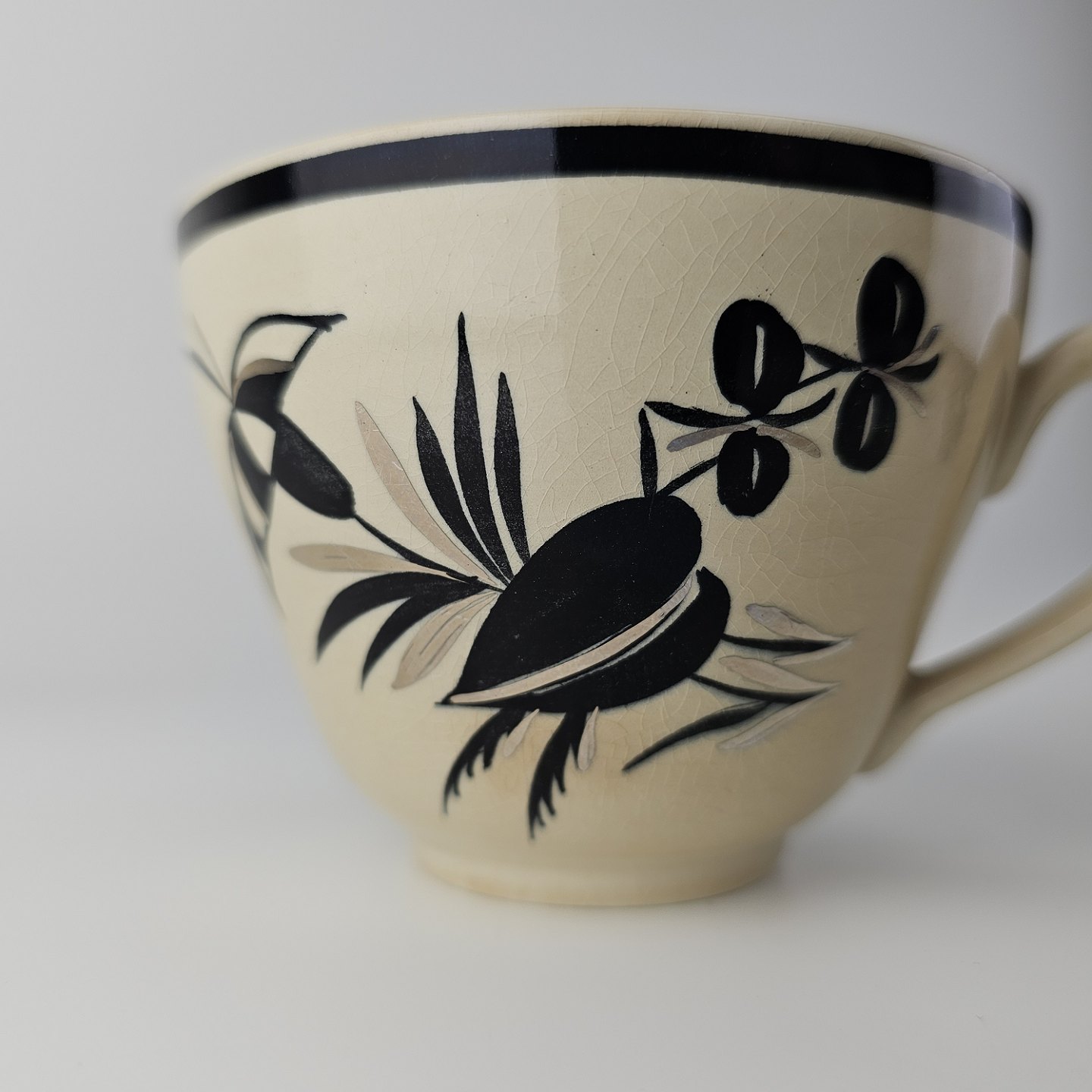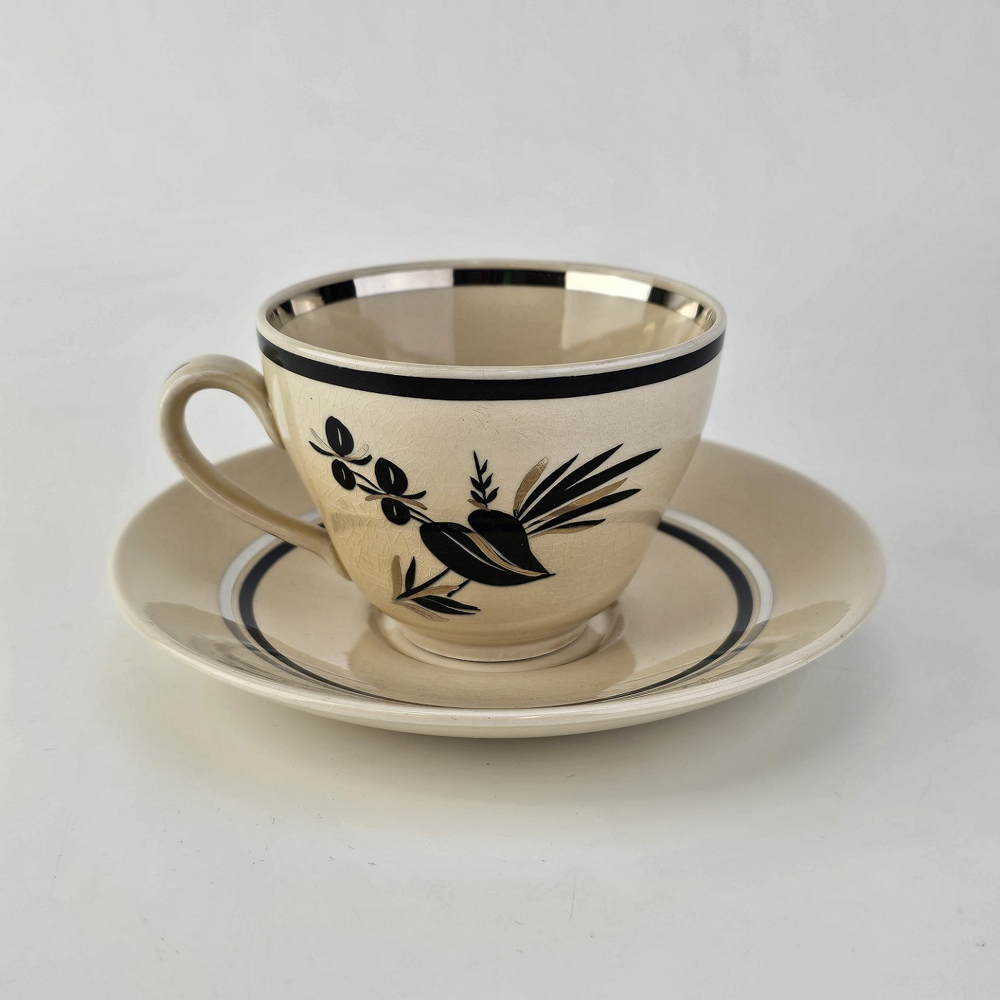Råhvidt fajancestel i stelform E med dekoration af naturmotiver i sølv og sort farve.