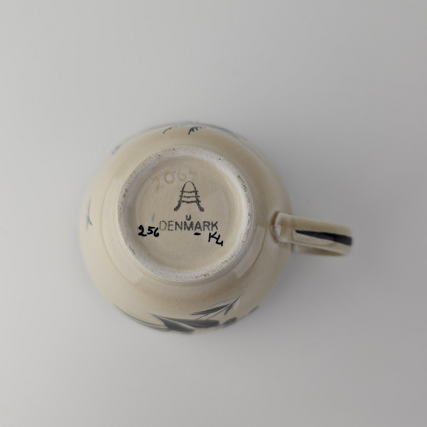 Kaffekop med underkop i fajance fra stellet Dragsholm fremstillet i perioden 1934-1965. Nr. 2064