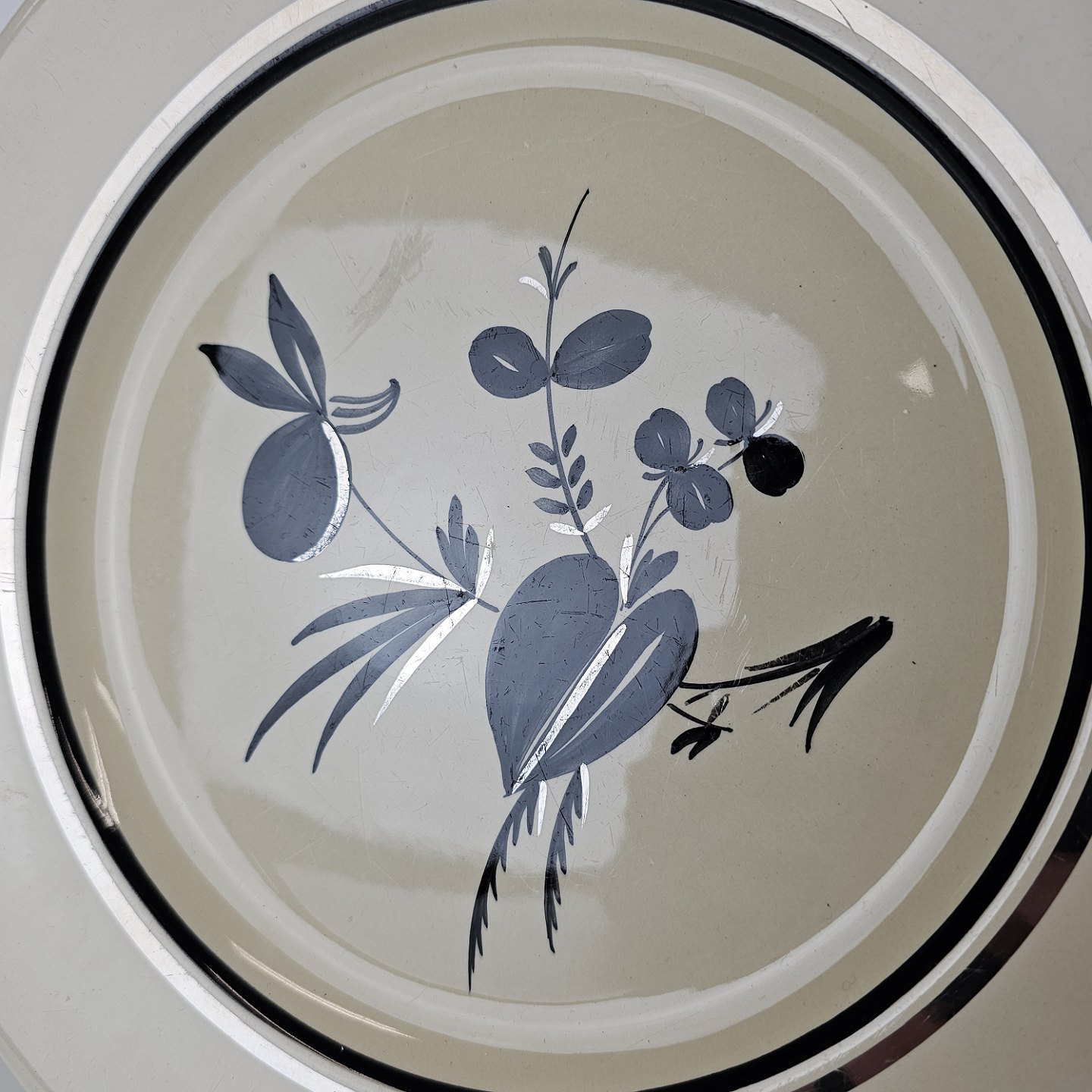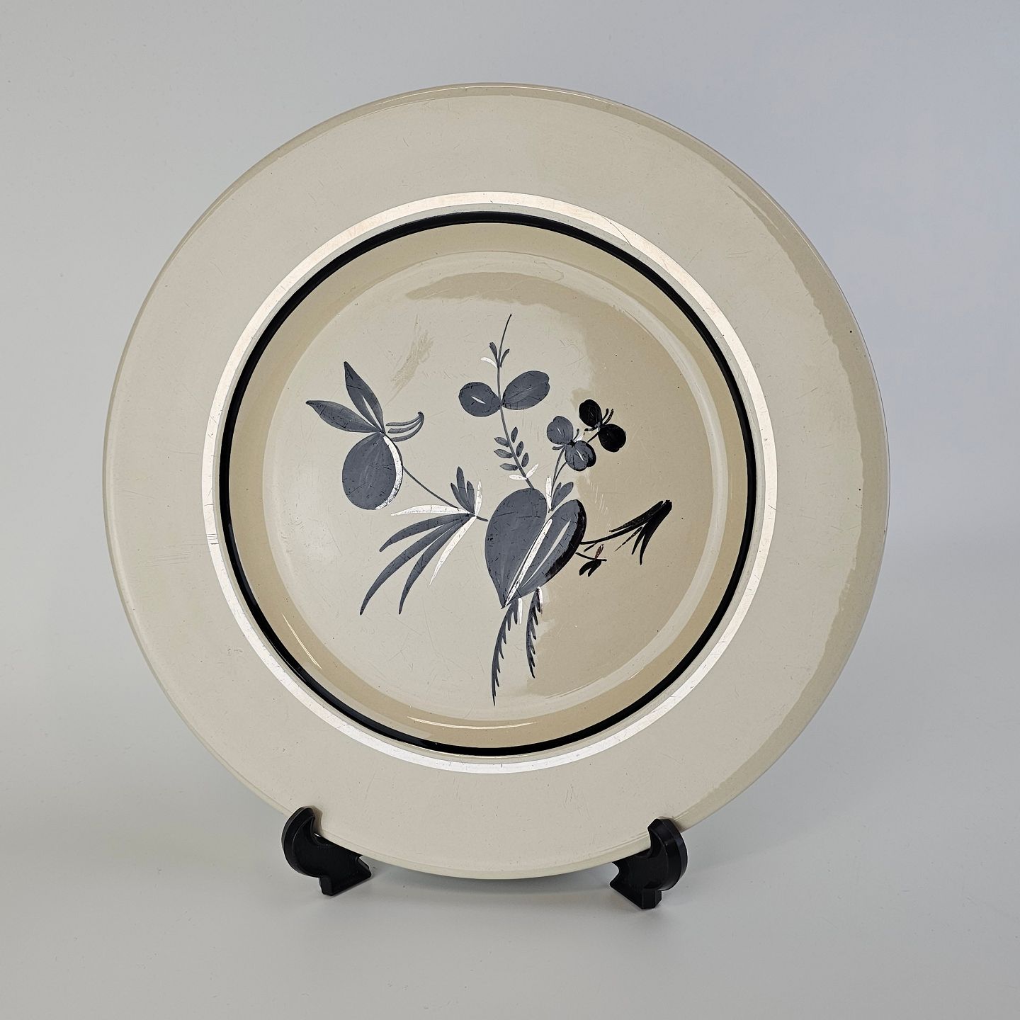 Råhvidt fajancestel i stelform E med dekoration af naturmotiver i sølv og sort farve.