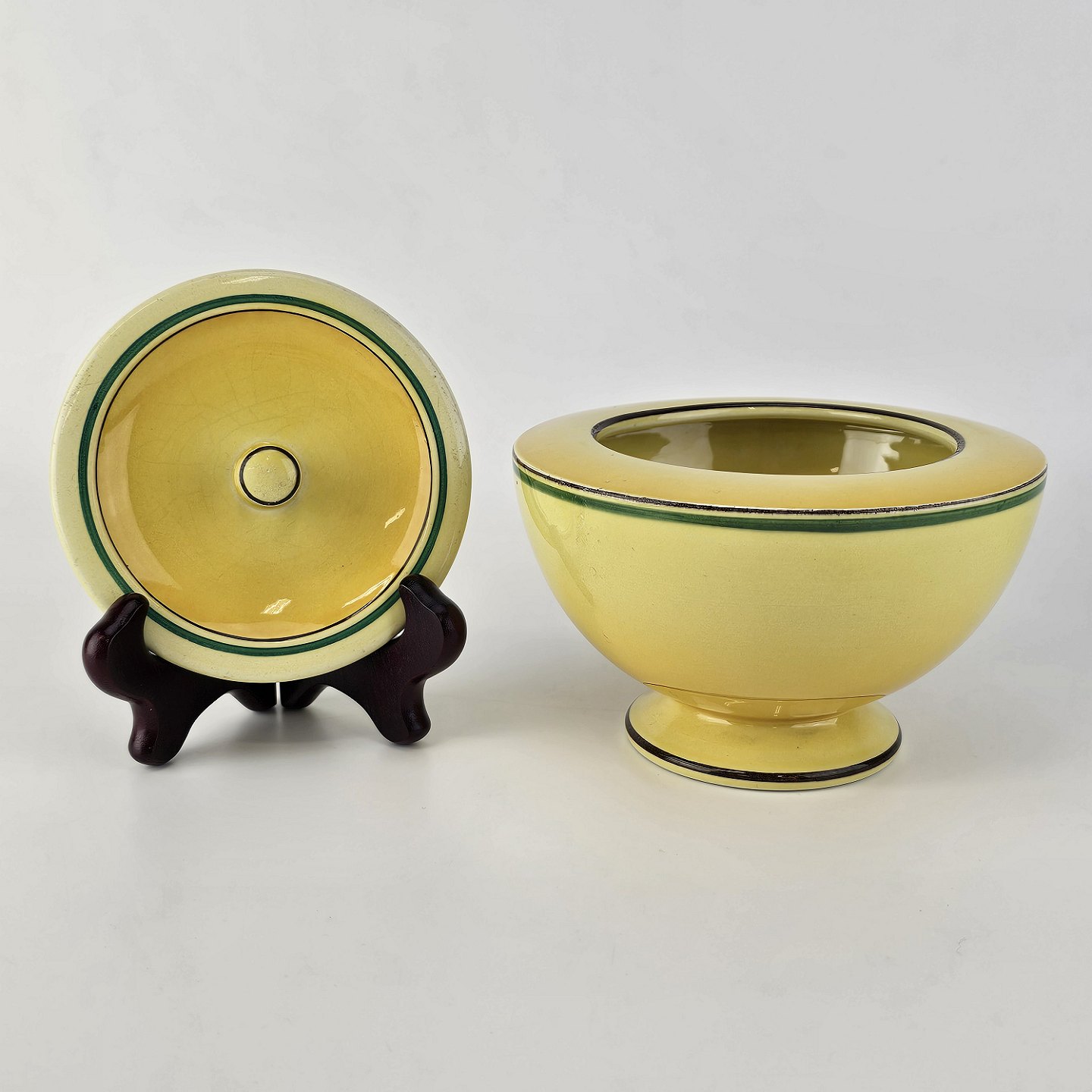 Fajancestel i stelform C med dekoration i gule nuancer med grøn stribe.