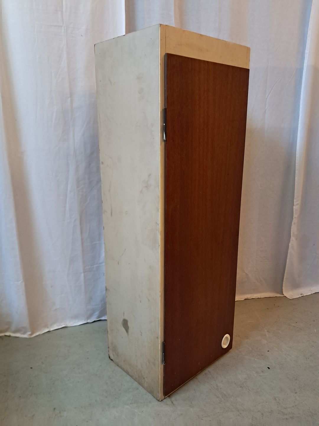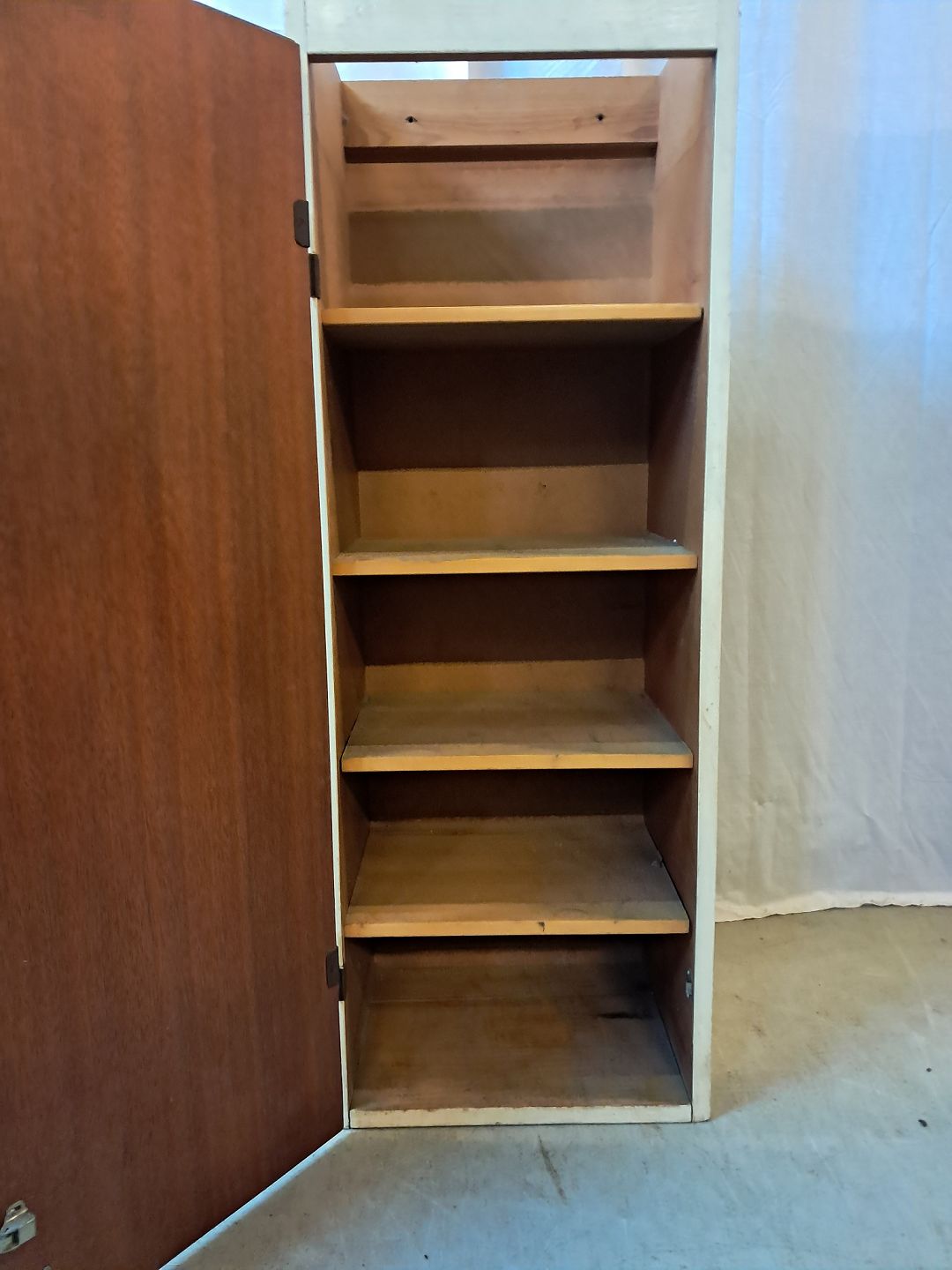 Gammelt malet køkkenskab med låge i fineret mahogni, fra 1950erne.Det trænger til at blive peppet op.