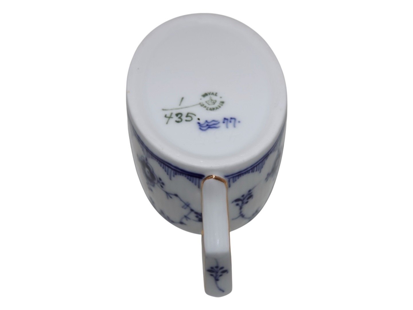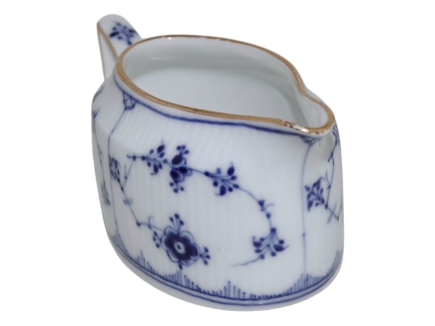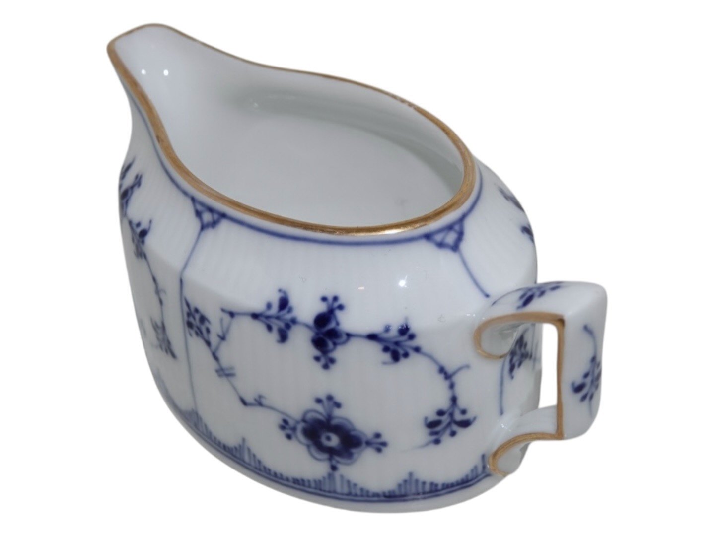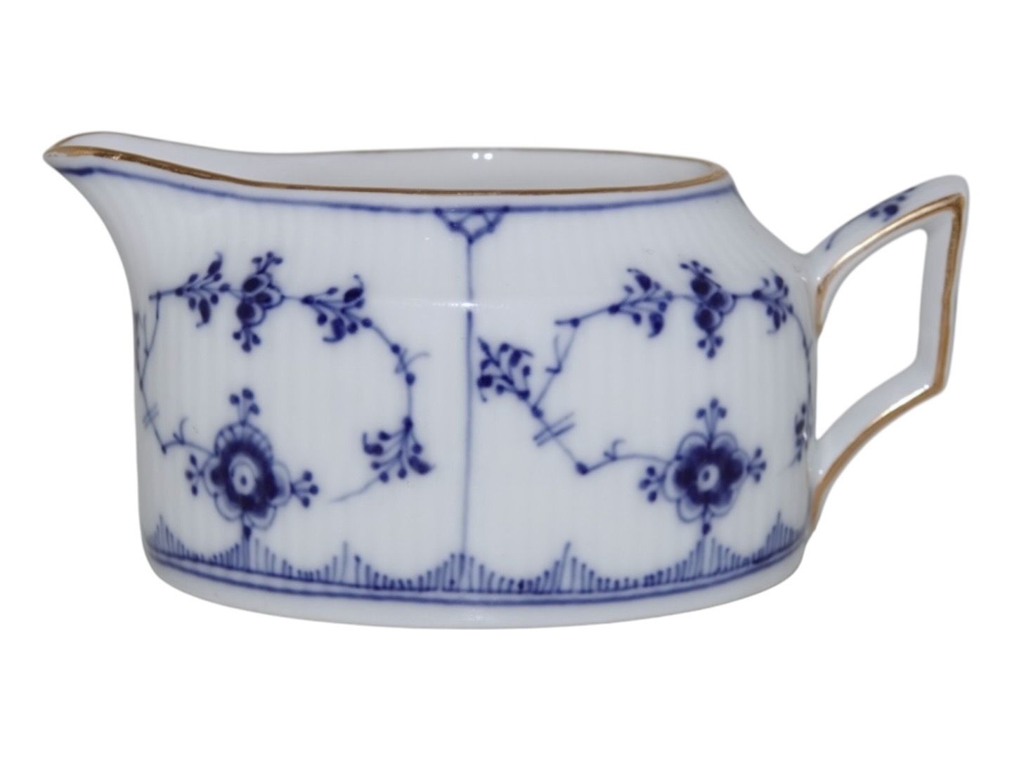 Royal Copenhagen Musselmalet Riflet med guldkant, sjælden, oval flødekande. Af fabriksmærket kan det udledes, at denne er produceret mellem 1898 og 1923.