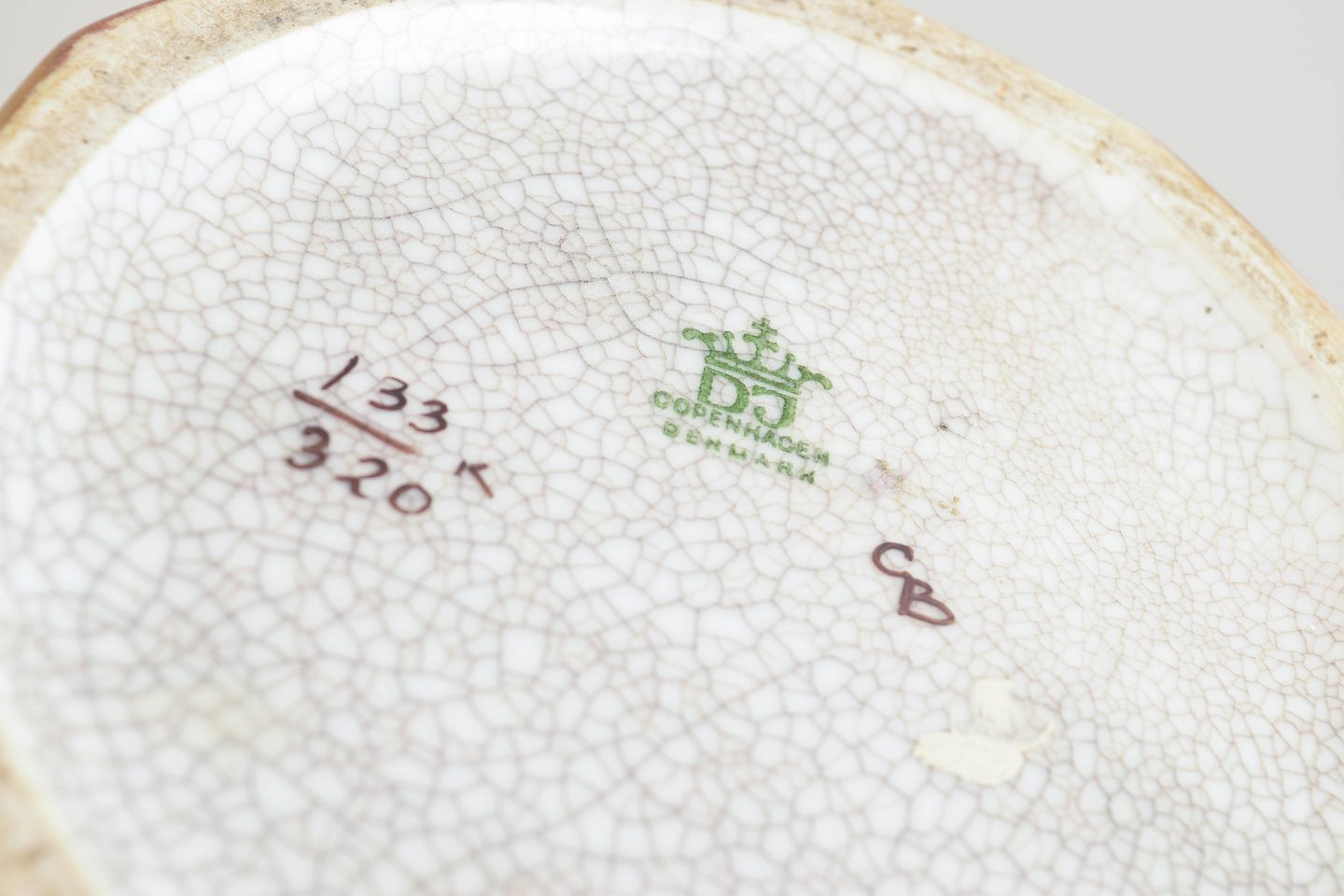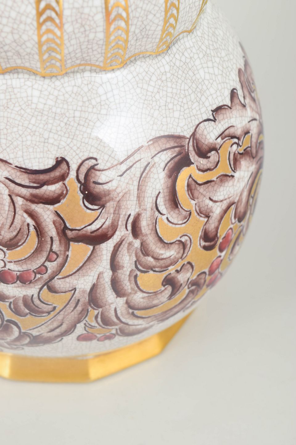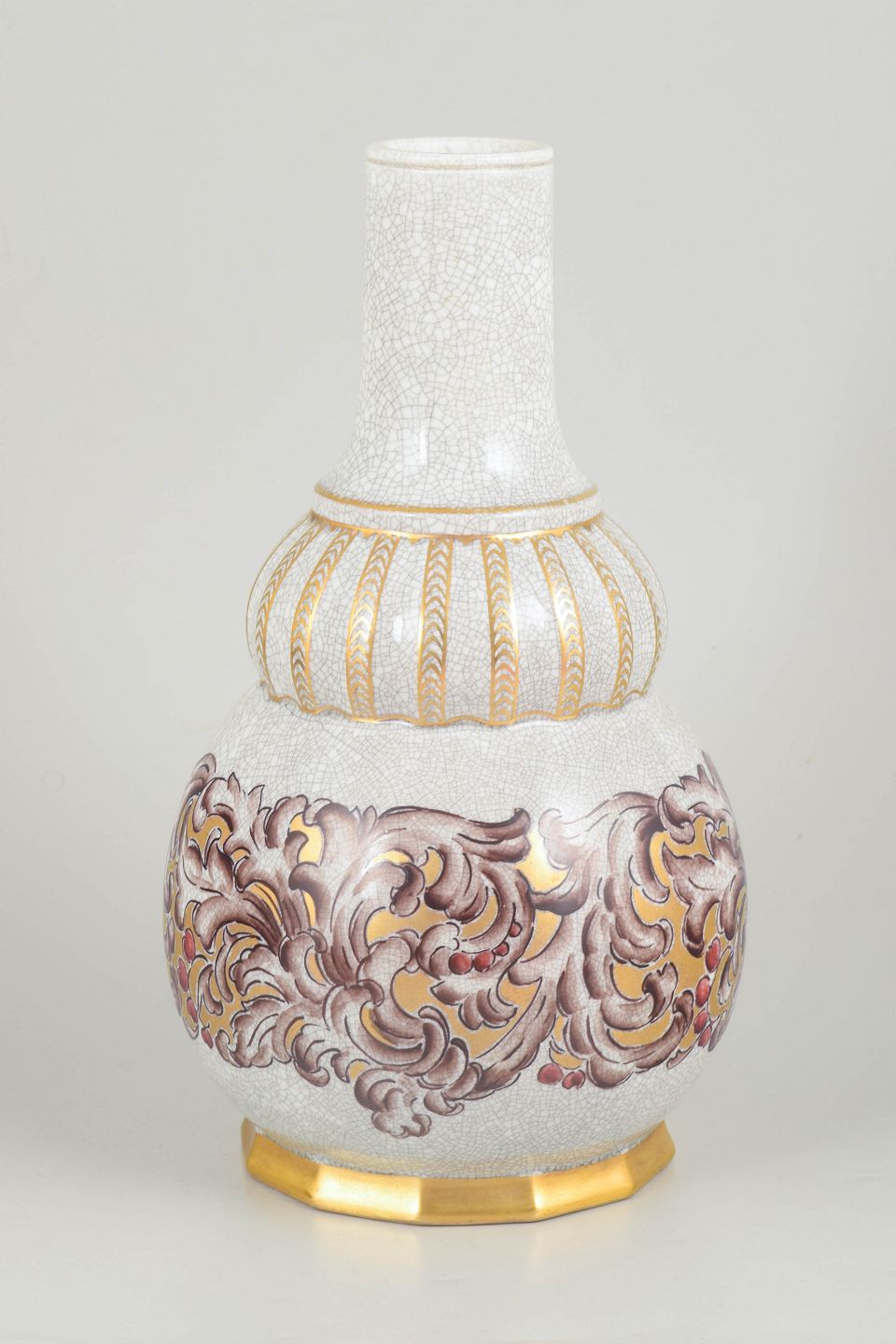 Elegant porcelænsvase med høj slank hals og balusterformet korpus dekoreret med reliefagtige ornamenter i guld og polykrome toner mod en krakeleret glasur. Formen og dekorationen afspejler den dekorative stil fra art deco-perioden. Modelnummer 133/320, stemplet Dahl-Jensen København i bunden.
