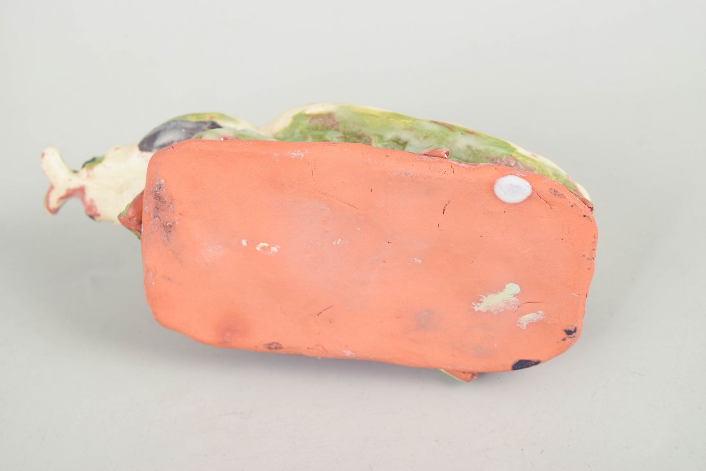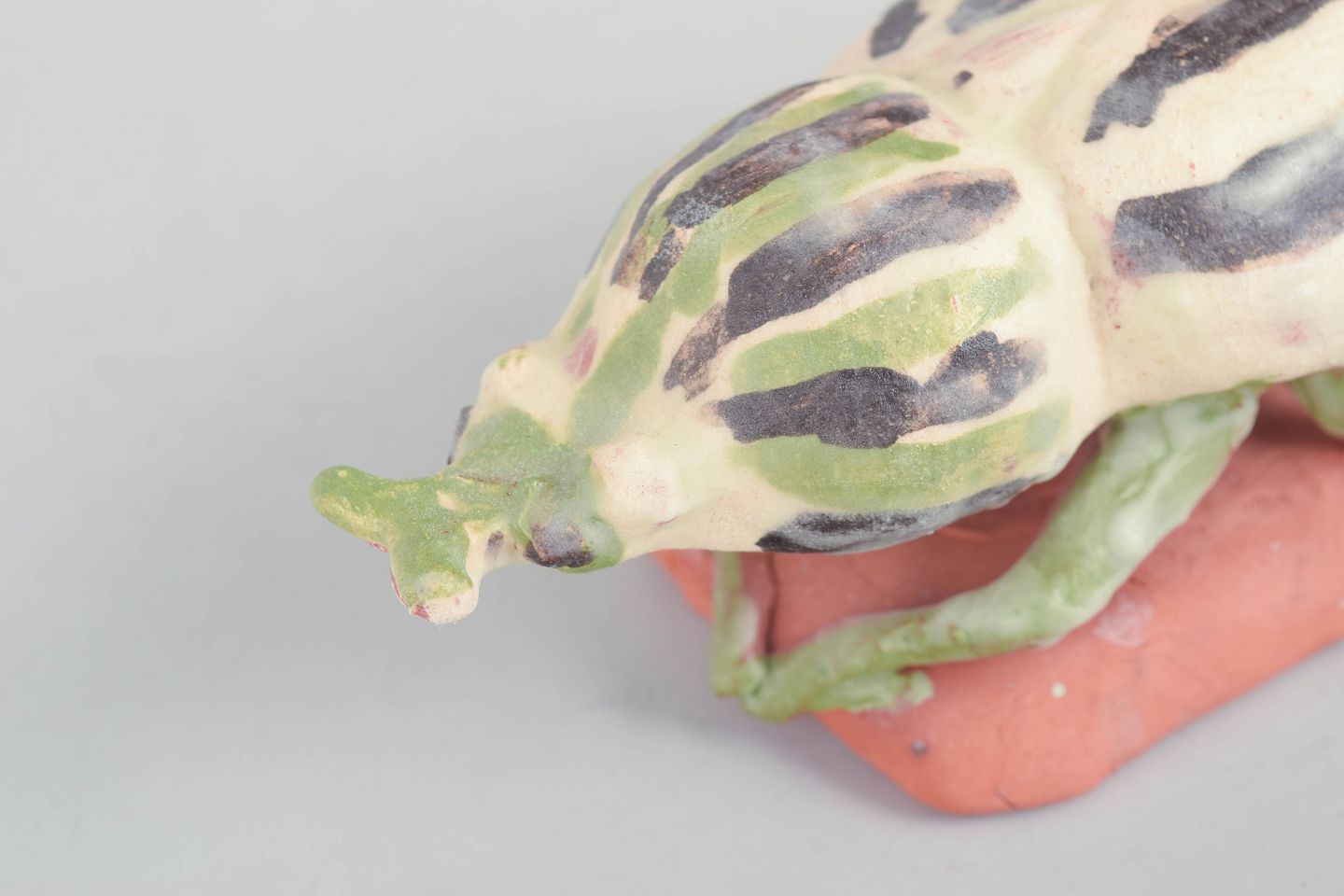 Nils-Erik Zetterström, insekt figur.Unik keramisk figur forestillende et insekt udført i stentøj med lys glasur dekoreret med grønne og mørke nuancer. Figuren er modelleret med en stiliseret, naturalistisk form og placeret på en lille base i ler, hvilket giver et skulpturelt og levende udtryk. Usigneret unika fra 1970’erne.