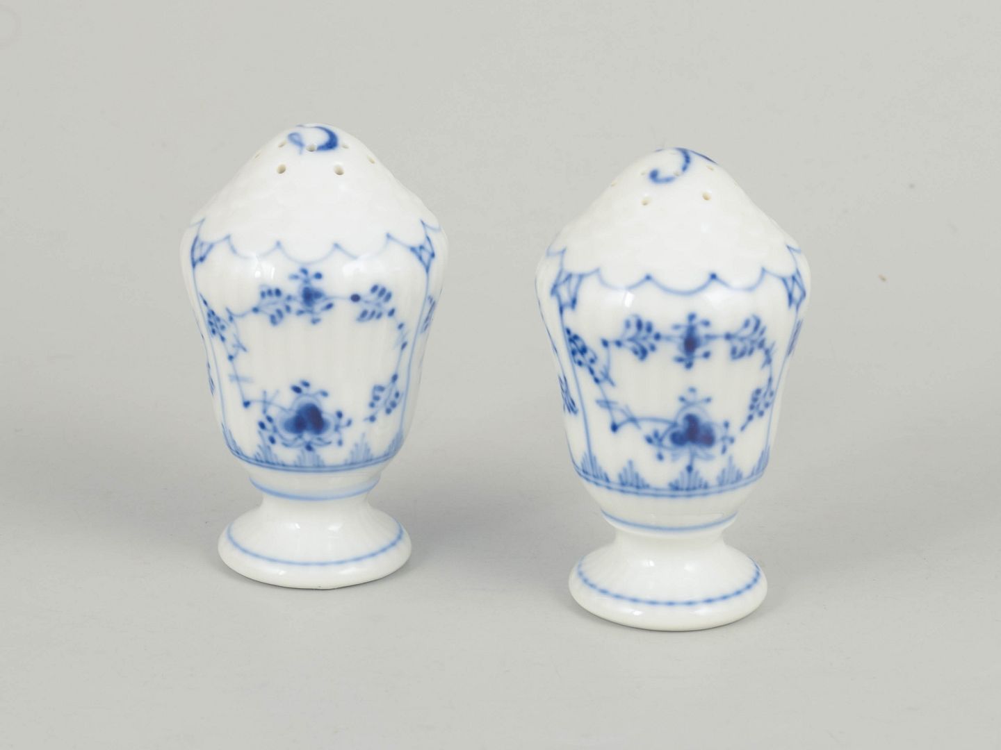 Håndmalet salt- og pebersæt i porcelæn dekoreret med det klassiske musselmalede riflet mønster i blå underglasur. Begge dele er udført i en elegant balusterform med lille fod og afrundet top med huller. Undersiden er fabriksstemplet Royal Copenhagen, første sortering. Model 1/467 og 1/480.