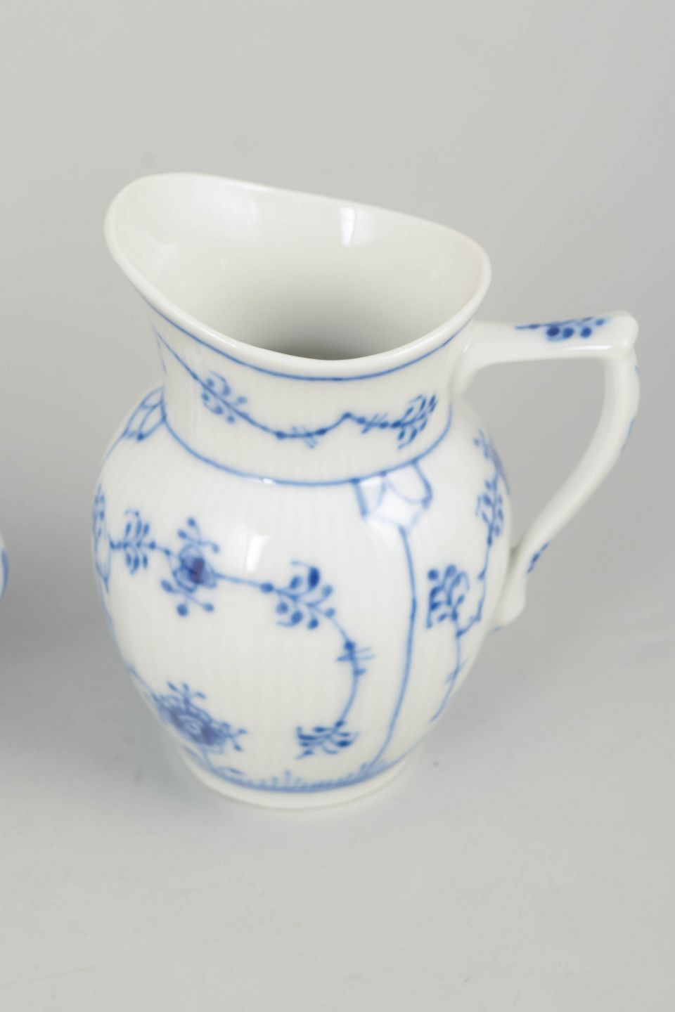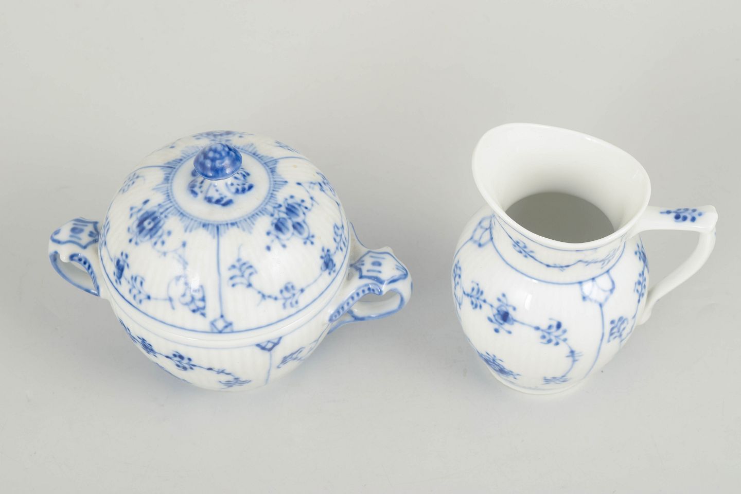 Håndmalet sukkerskål med låg og tilhørende flødekande i porcelæn dekoreret med det klassiske musselmalede riflet mønster i blå underglasur. Sukkerskålen har rund korpus med to svungne hanke og kuppelformet låg med knop, mens flødekanden har elegant svungen form med tud og hank. Begge dele er fabriksstemplet Royal Copenhagen, første sortering. Flødekande model 1/60 og sukkerskål model 1/428.