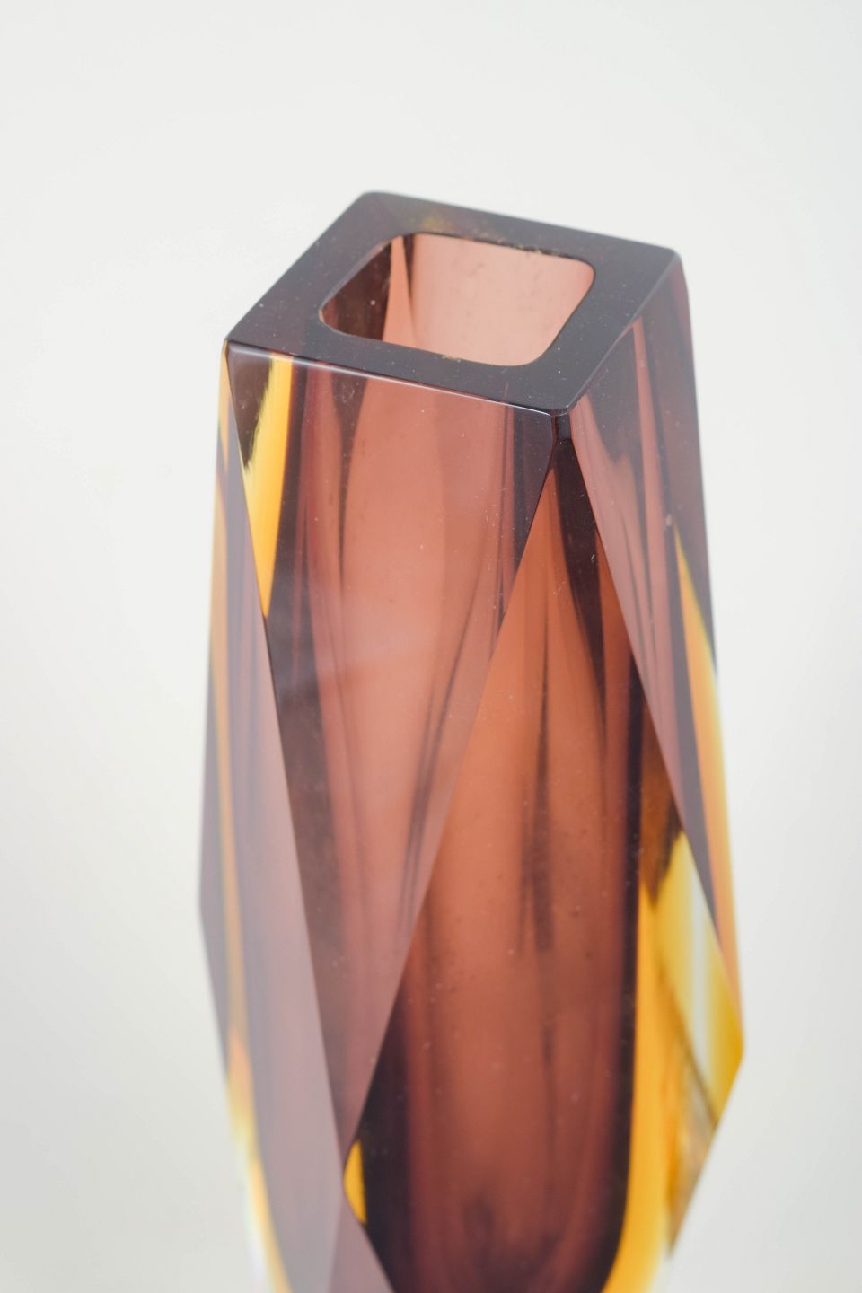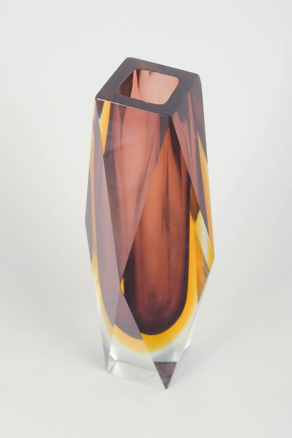 Murano, vase.Facetteret kunstglasvase i klart glas med indkapslet ravfarvet kerne og geometrisk slebne sider, udført i karakteristisk Murano-stil med kraftig skulpturel form.