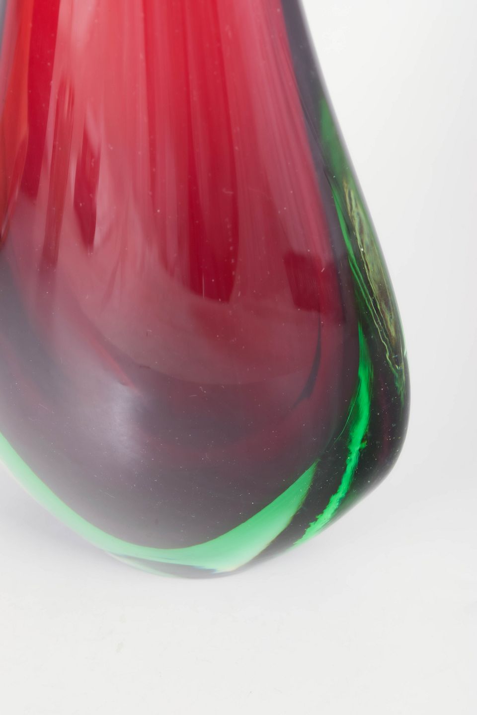 Murano, gulvvase.Elegant kunstglasvase i klart glas med indkapslet rød kerne og grøn tone i bunden samt meget lang slank hals, udført i karakteristisk Murano-stil med skulpturel dråbeform.