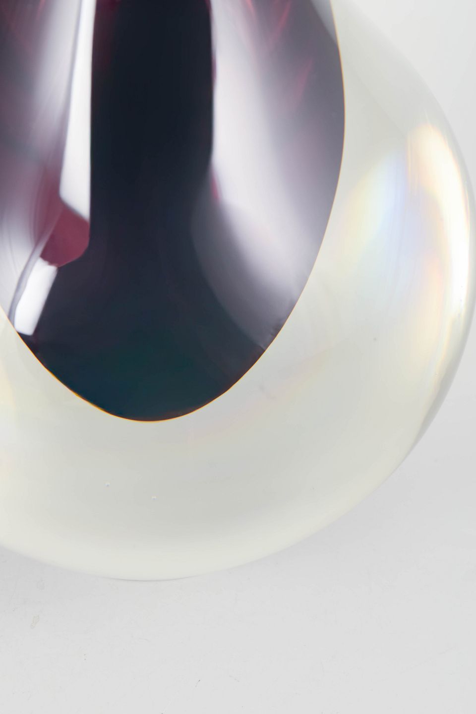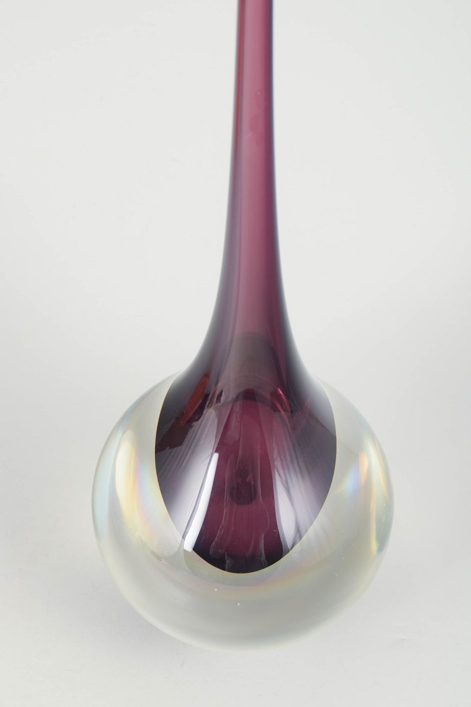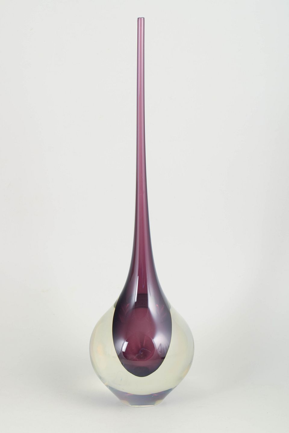 Murano, gulvvase.Elegant kunstglasvase i klart glas med indkapslet violet kerne og meget lang slank hals, udført i karakteristisk Murano-stil med skulpturel dråbeform.