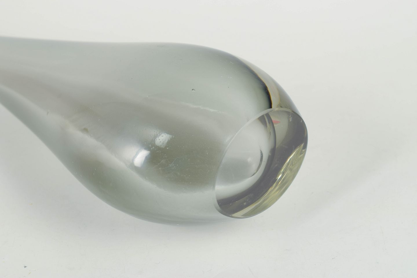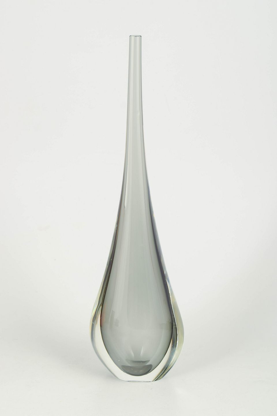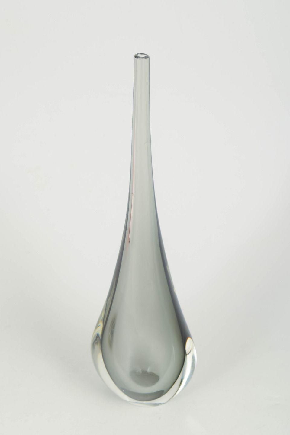 Murano, vase.Slank kunstglasvase i klart glas med elegant dråbeformet silhuet og lang smal hals, udført i karakteristisk Murano-stil med tung bund og raffineret form.