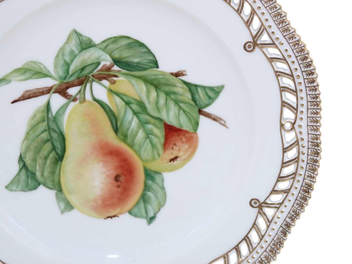 Royal Copenhagen Flora Danica, frugttallerken dekoreret med en pære og med gennembrudt kant.