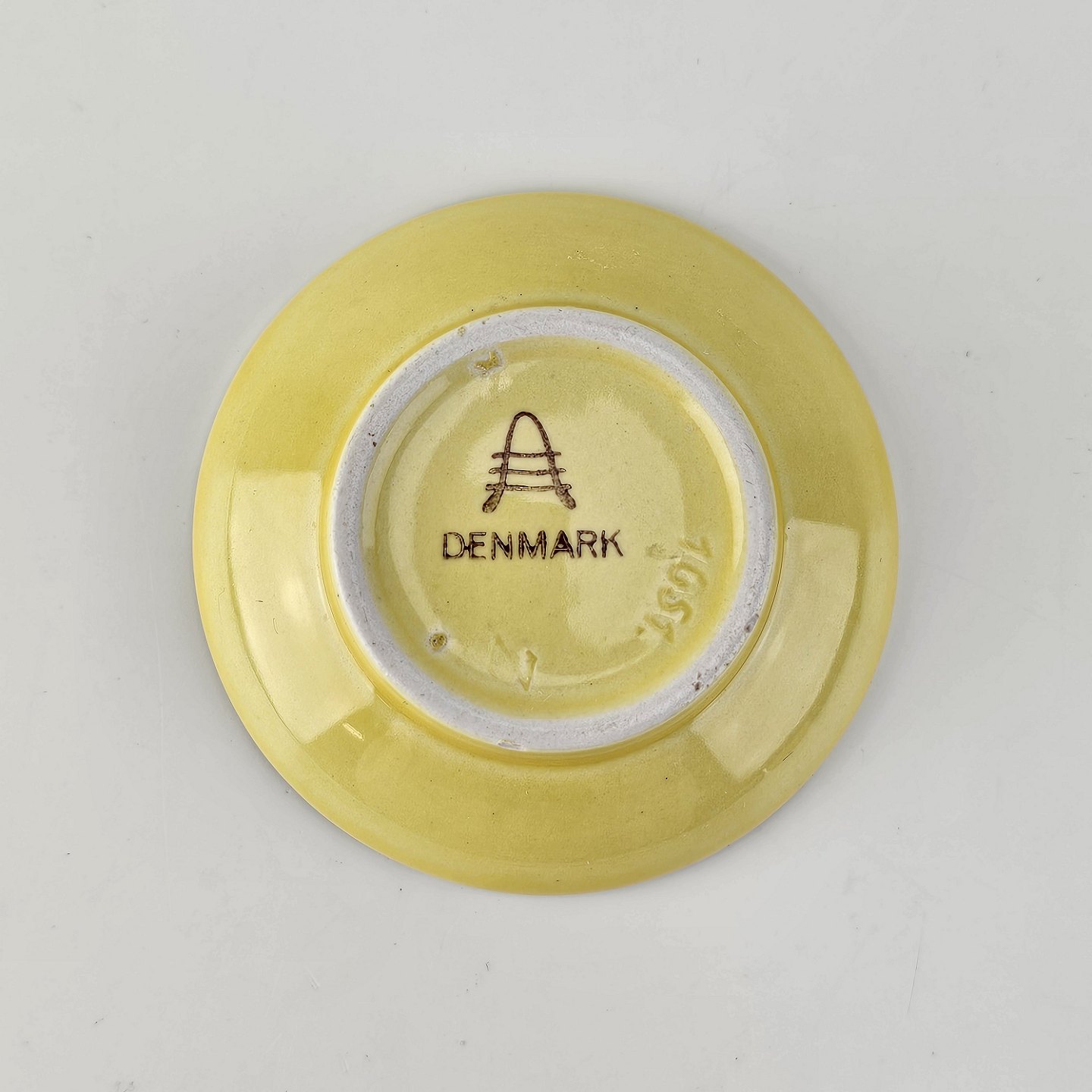 Fajancestel i stelform C med dekoration i gule nuancer med grøn stribe.