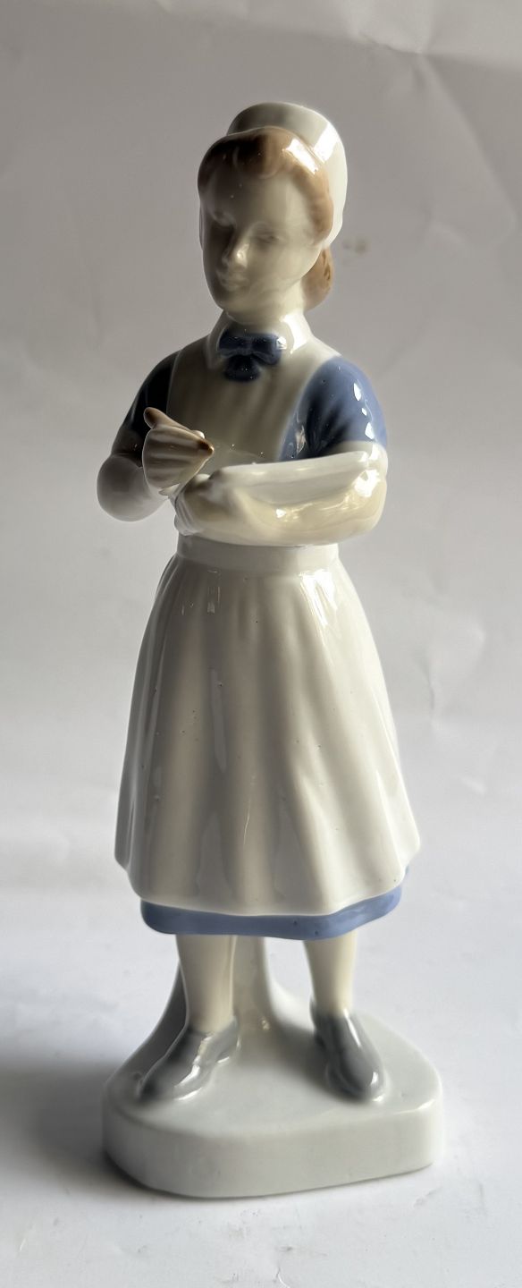 Figur af kvindelig sygeplejerske i porcelæn. I god stand uden skader eller reparationer. Fabriksmærket på bunden. H. 19,7 cm