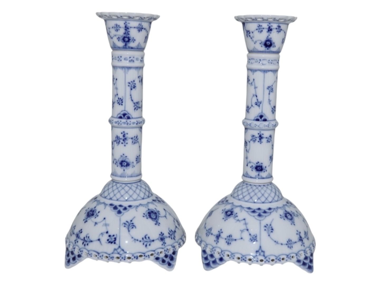 Royal Copenhagen Musselmalet Helblonde, to høje lysestager.Af fabriksmærket kan det udledes, at disse er produceret mellem 1992 og 1999.