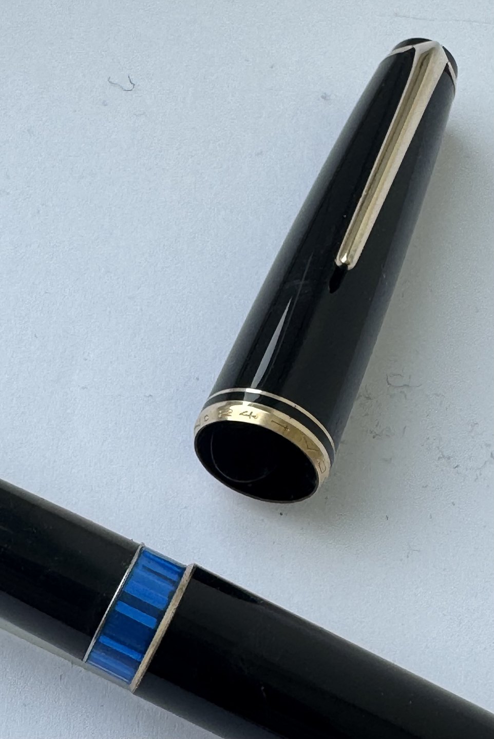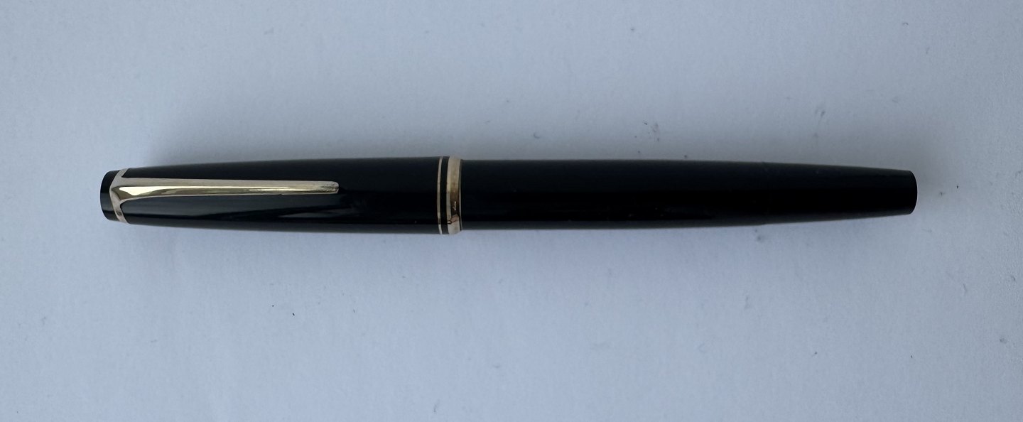 Sort Montblanc nr. 24 fyldepen fra omkring 1970. Fremstår i god stand. Klar til at blive brugt. Piston filler blæk-påfyldning. Alle dele originale. Fyldepennen er 13,7 cm lang