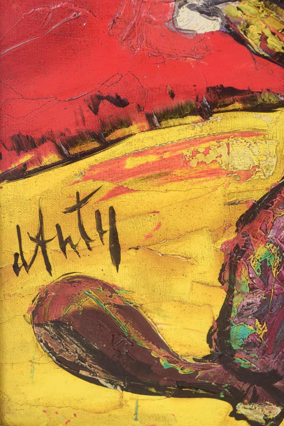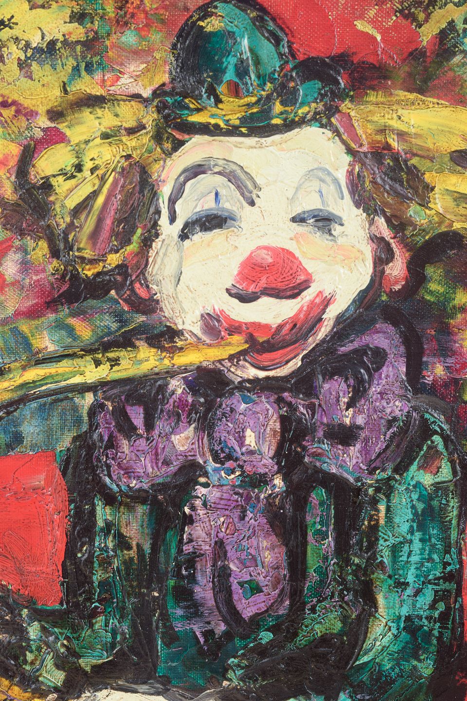 Henry d’Anty, oliemaleri på lærred, fransk kunstner.Farverig figurativ komposition med klovn, der spiller saxofon, udført i kraftige ekspressive penselstrøg og en intens palet domineret af røde, gule og grønne toner. Maleriet er signeret nederst og udført i kunstnerens karakteristiske stil med tykke lag maling og markerede konturer.