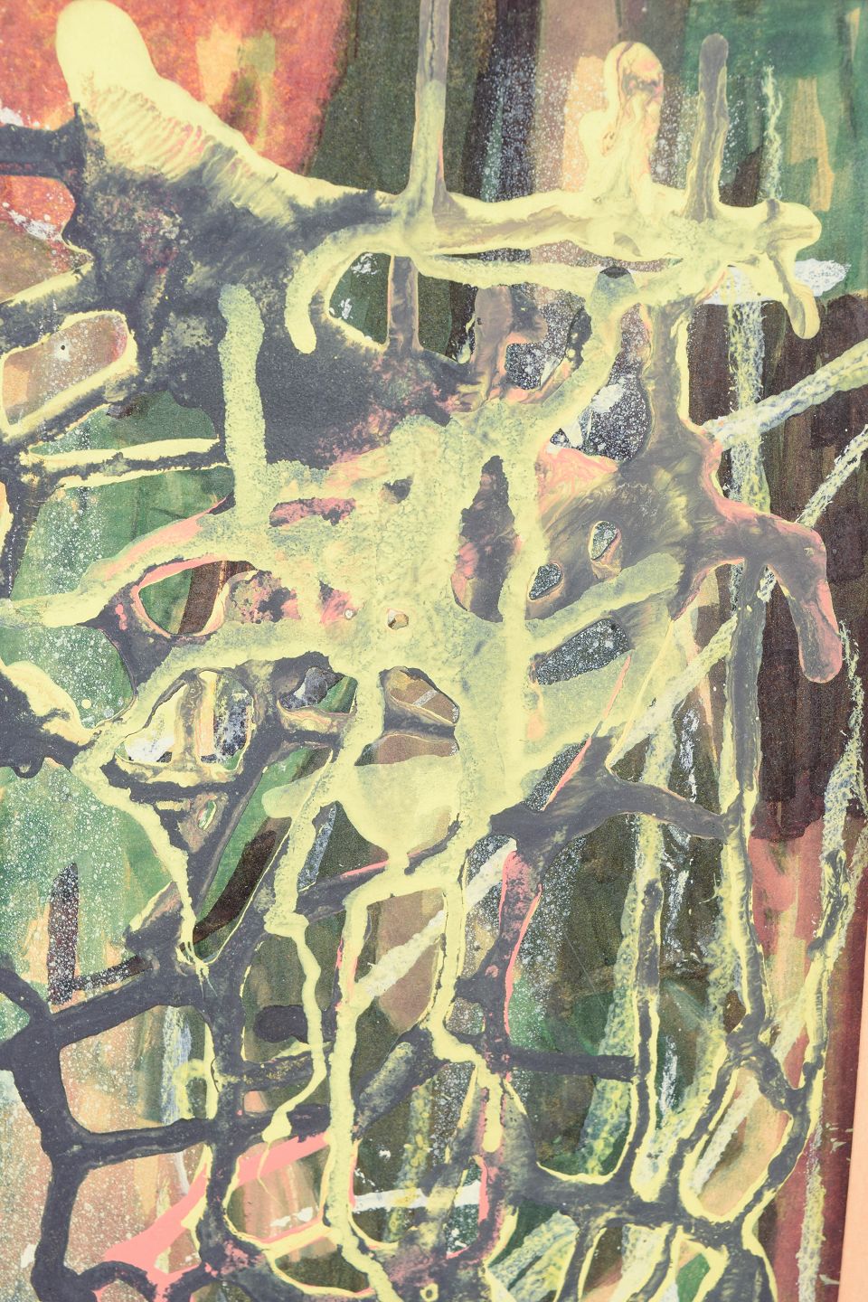 Gunnar Fohlin, mixed media på papir, svensk kunstner.Abstrakt komposition udført i mixed media på papir med kraftige lag af farve, dryppede linjer og ekspressive penselstrøg i grønne, gule, sorte og rosa toner. Kompositionen har et spontant og gestisk udtryk med overlappende former og strukturer.