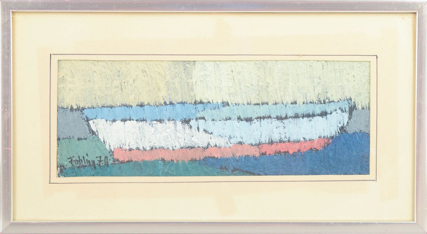 Gunnar Fohlin, oliemaleri på papir, svensk kunstner.Abstrakt landskabskomposition udført i olie på papir med brede, strukturerede penselstrøg i blå, hvide og grønne toner med et horisontalt bånd i rødligt nuance. Kompositionen har en tydelig horisontal opbygning, der giver associationer til hav og kystlandskab.
