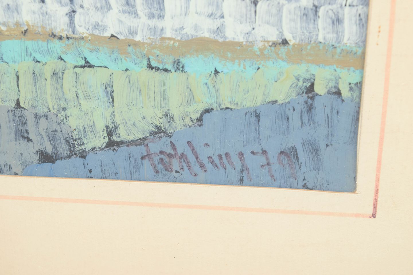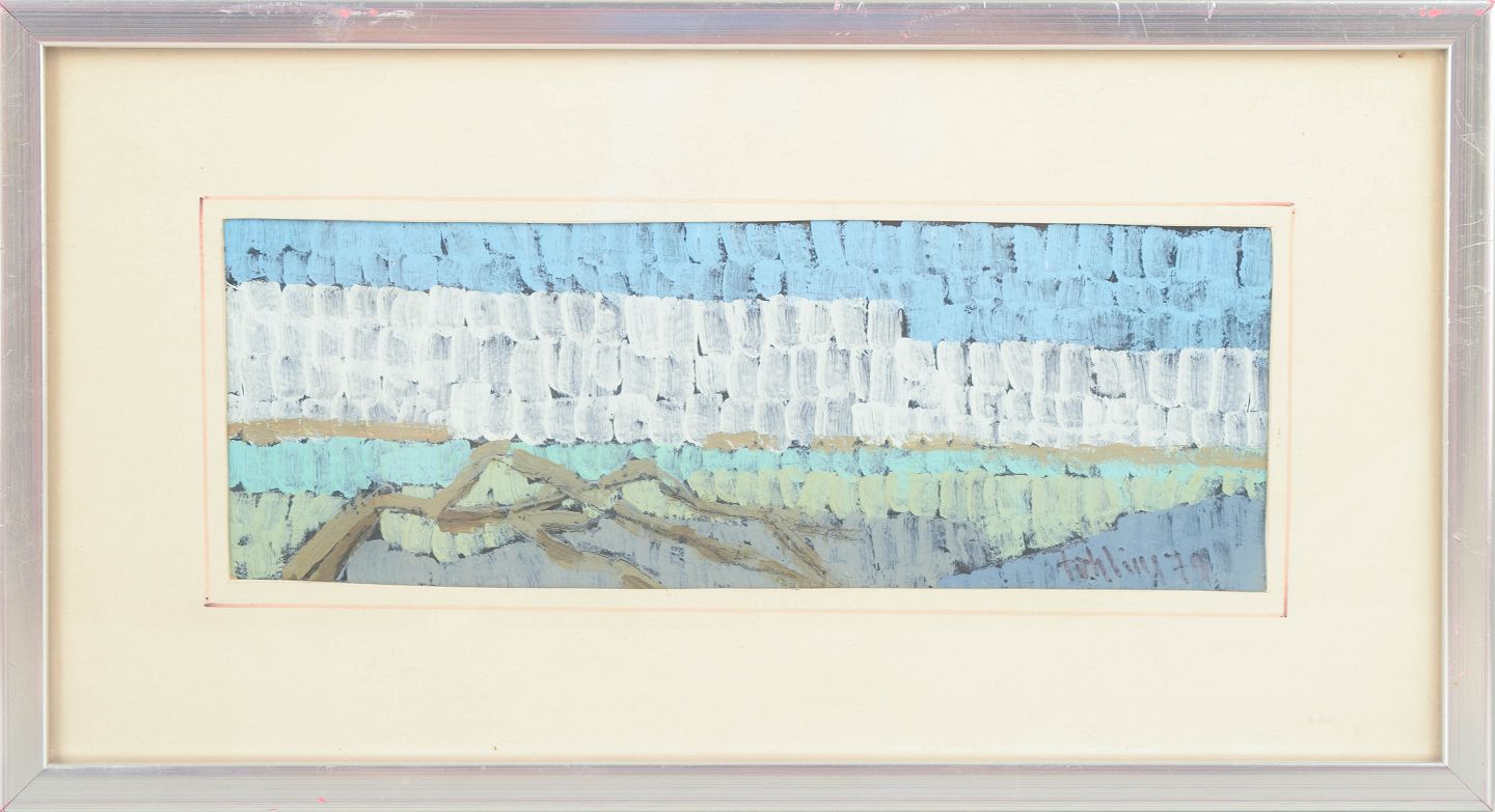 Gunnar Fohlin, oliemaleri på papir, svensk kunstner.Abstrakt landskabskomposition udført i olie på papir med brede, strukturerede penselstrøg i lyse blå, hvide og jordfarvede toner. Kompositionen fremstår med horisontal opbygning, der leder tankerne mod et stiliseret kyst- eller landskabsmotiv.