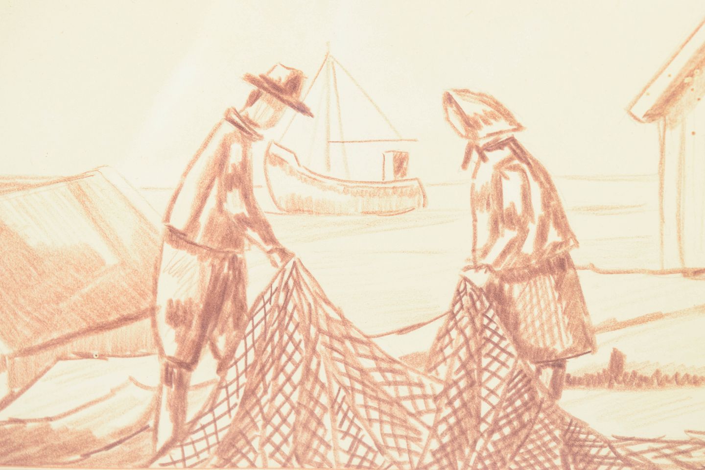 Figurativ komposition udført som blyanttegning med motiv af to fiskere, der arbejder med et net i et kystlandskab med både og huse i baggrunden.