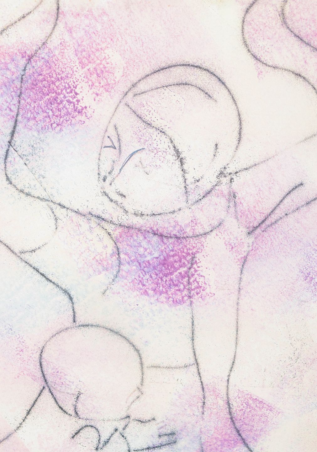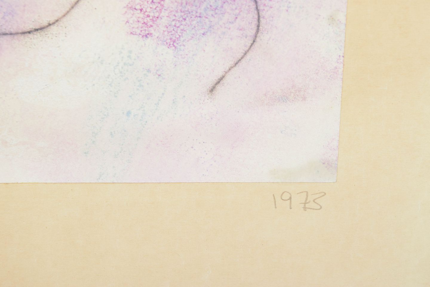 Robert Beauchamp, mixed media, amerikansk billedkunstner.Figurativ komposition med mor og barn udført i pastel på papir, dateret 1973. Motivet er tegnet med en fri og ekspressiv streg og bløde farvefelter i rosa og violette toner.